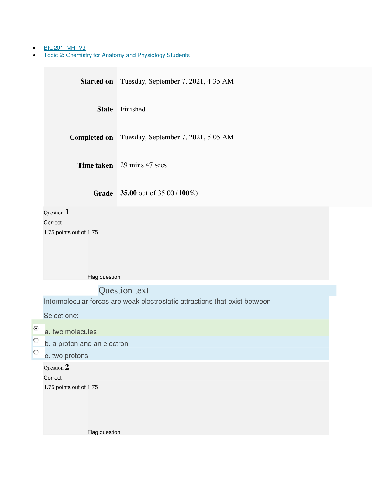 BIO201_MH_V3 Topic 2: Chemistry for Anatomy and Physiology Students Started on Tuesday, September 7, 2021, 4:35 AM State Finished Completed on Tuesday, September 7, 2021, 5:05 AM Time taken 2...
