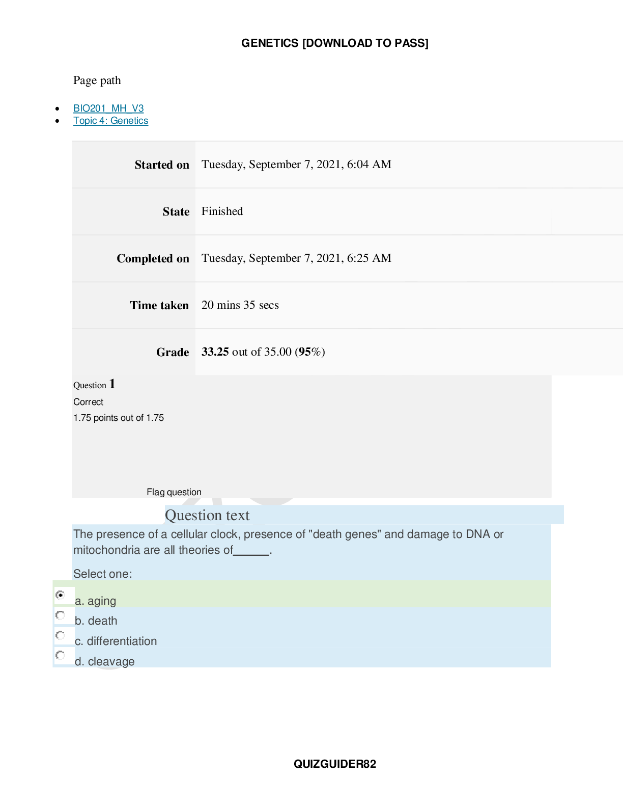 Page path BIO201_MH_V3 Topic 4: Genetics Started on Tuesday, September 7, 2021, 6:04 AM State Finished Completed on Tuesday, September 7, 2021, 6:25 AM Time taken 20 mins 35 secs Grade 33.2...