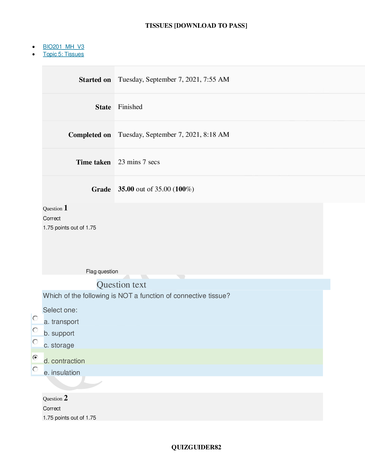BIO201_MH_V3 Topic 5: Tissues Started on Tuesday, September 7, 2021, 7:55 AM State Finished Completed on Tuesday, September 7, 2021, 8:18 AM Time taken 23 mins 7 secs Grade 35.00 out of 35.0...