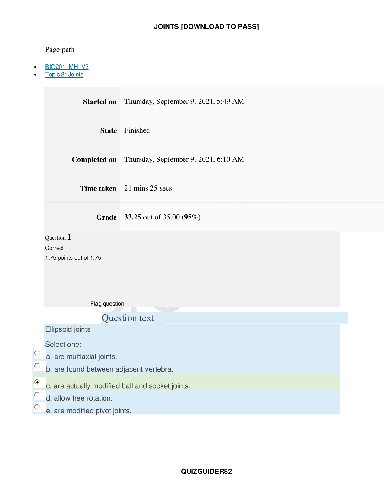 Page path BIO201_MH_V3 Topic 8: Joints Started on Thursday, September 9, 2021, 5:49 AM State Finished Completed on Thursday, September 9, 2021, 6:10 AM Time taken 21 mins 25 secs Grade 33.2...