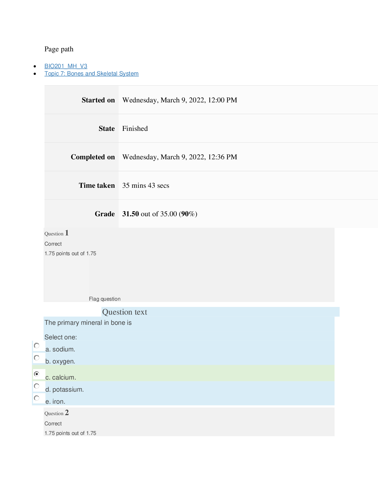 Page path BIO201_MH_V3 Topic 7: Bones and Skeletal System Started on Wednesday, March 9, 2022, 12:00 PM State Finished Completed on Wednesday, March 9, 2022, 12:36 PM Time taken 35 mins 43 s...