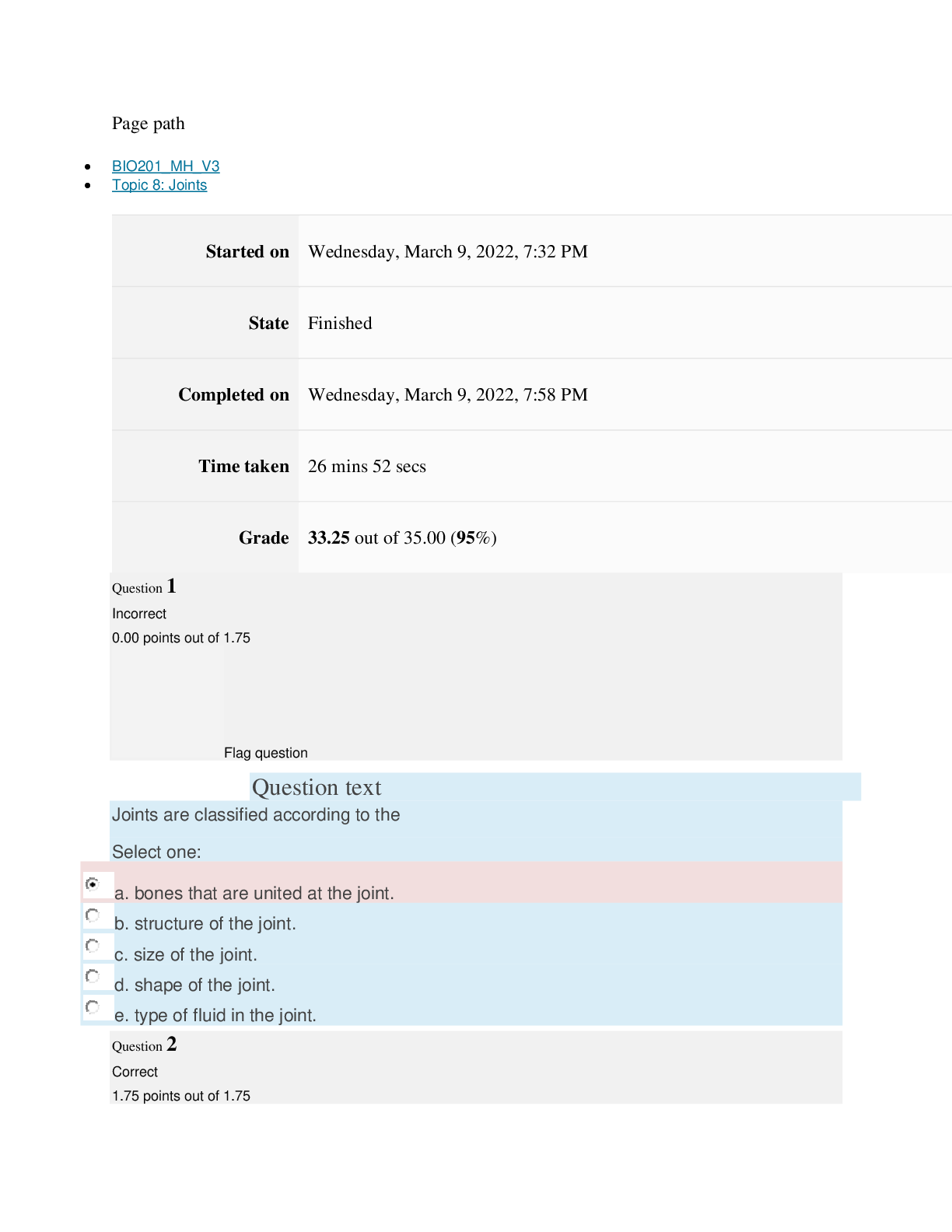 Page path BIO201_MH_V3 Topic 8: Joints Started on Wednesday, March 9, 2022, 7:32 PM State Finished Completed on Wednesday, March 9, 2022, 7:58 PM Time taken 26 mins 52 secs Grade 33.25 out...