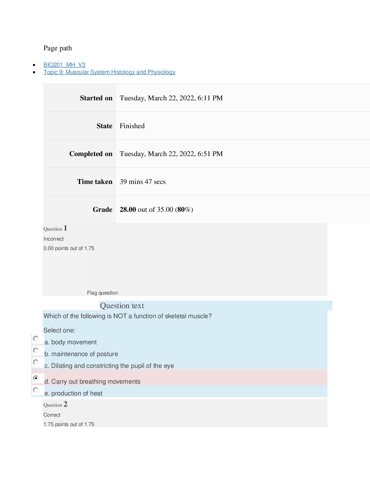 Page path BIO201_MH_V3 Topic 9: Muscular System Histology and Physiology Started on Tuesday, March 22, 2022, 6:11 PM State Finished Completed on Tuesday, March 22, 2022, 6:51 PM Time taken 3...