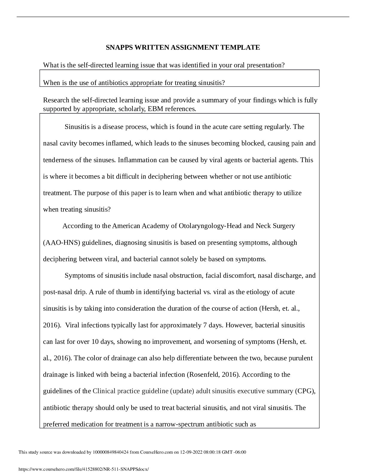 *NURSING> QUESTIONS & ANSWERS > NR 511 Week 3 Assignment: SNAPPS Written Assignment (GRADED) (All)