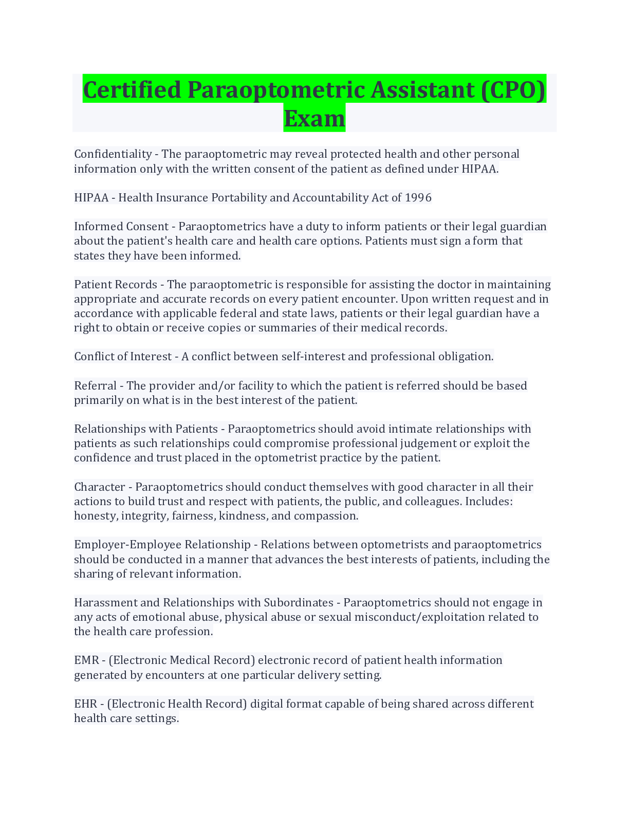 Business> EXAM > Certified Paraoptometric (CPO) Exam Study Guide Latest Update (All)
