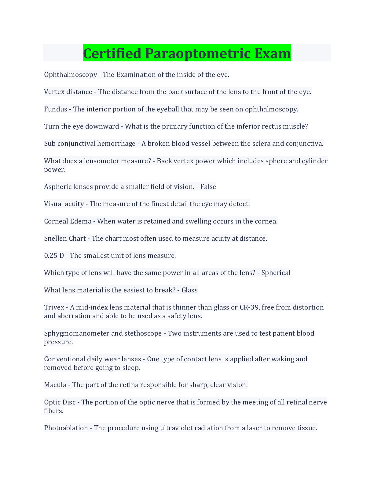 Medicine> EXAM > Certified Paraoptometric Exam Terms And Explanations (All)