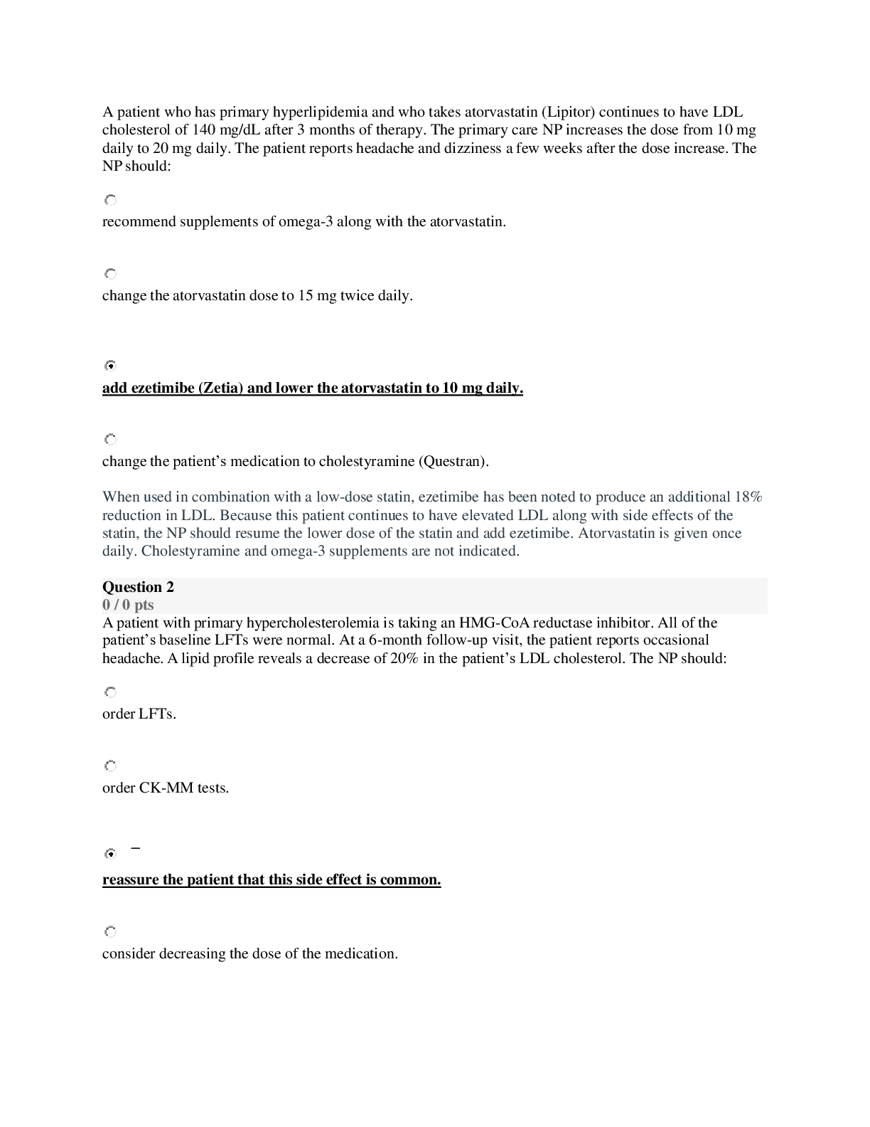 A patient who has primary hyperlipidemia and who takes atorvastatin (Lipitor) continues to have LDL cholesterol of 140 mg/dL after 3 months of therapy. The primary care NP increases the dose from 10 m...