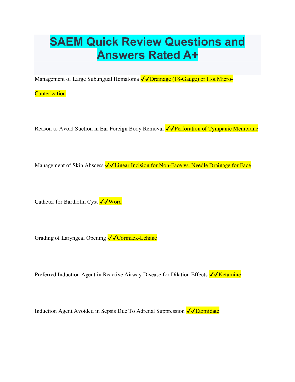 Medical Studies> QUESTIONS & ANSWERS > SAEM Quick Review Questions and Answers Rated A+ (All)