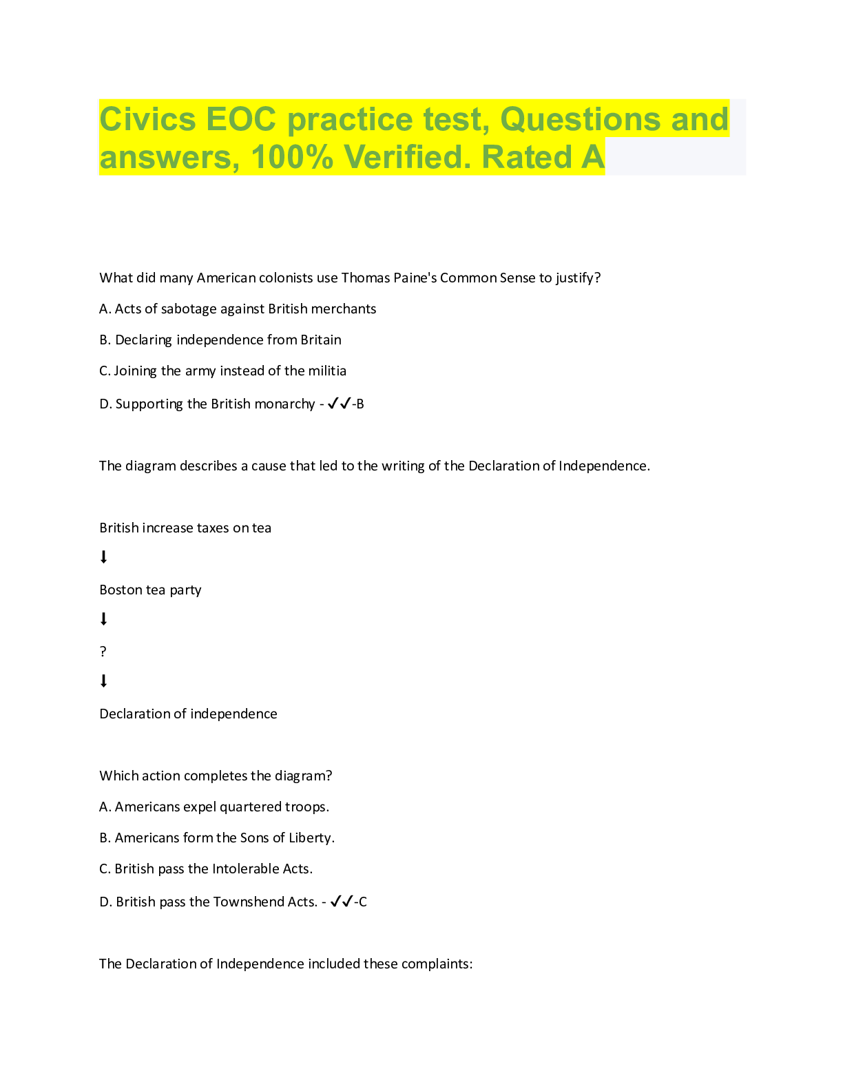 Civics EOC practice test, Questions and answers, 100% Verified. Rated A What did many American colonists use Thomas Paine's Common Sense to justify? A. Acts of sabotage against British merchants...