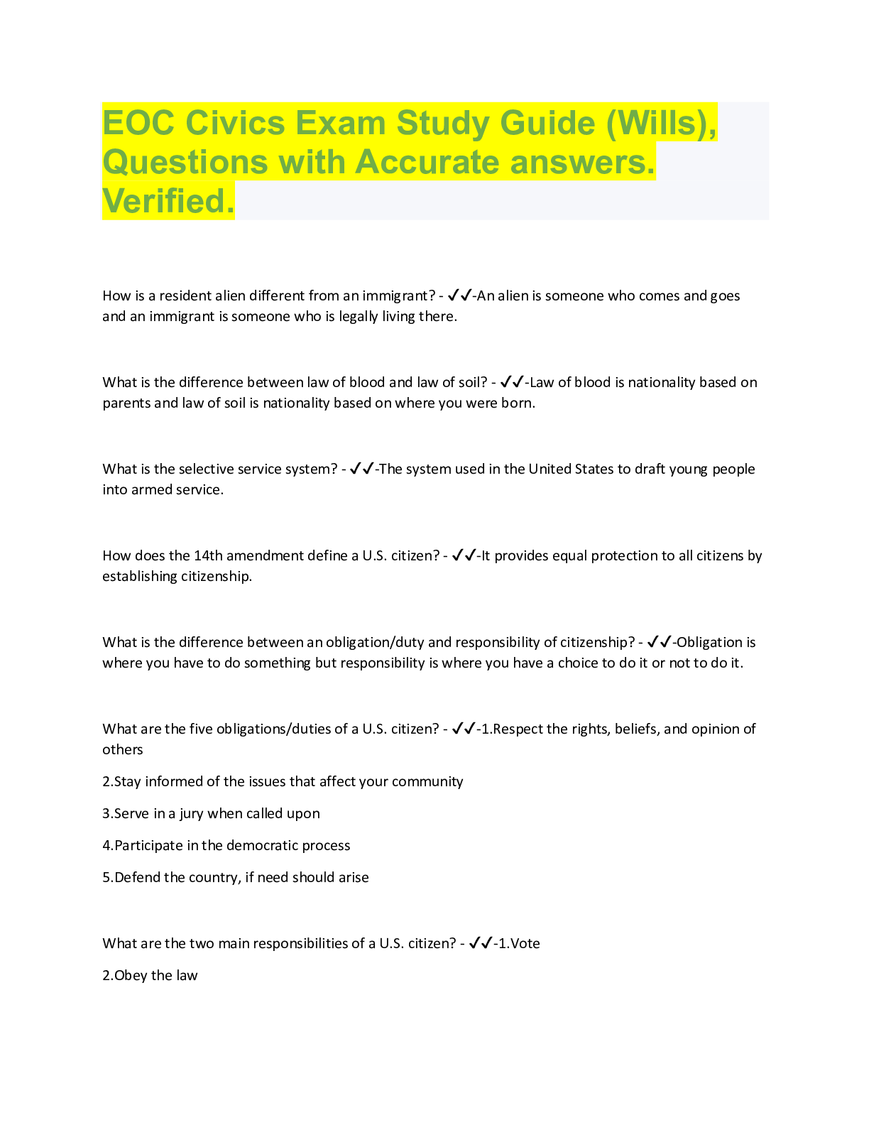 Social Sciences> QUESTIONS & ANSWERS > EOC Civics Exam Study Guide (Wills), Questions with Accurate answers. Verified. (All)