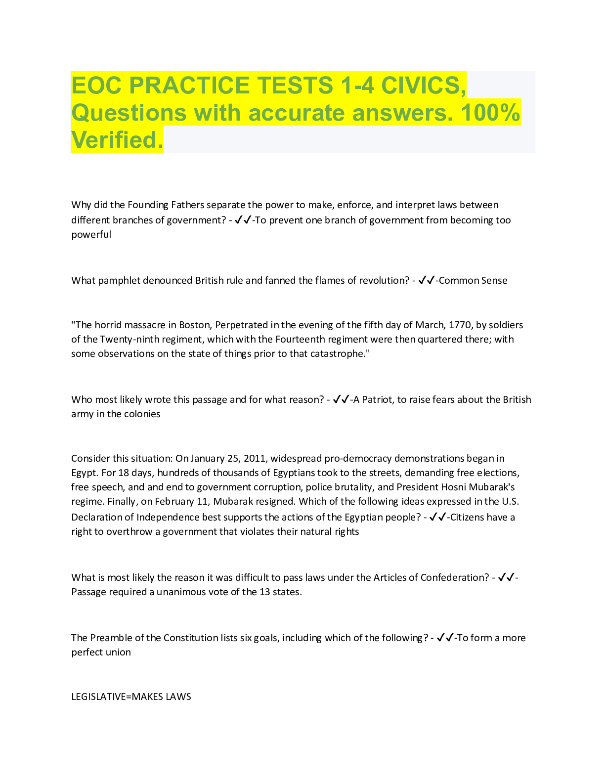 EOC PRACTICE TESTS. CIVICS, Questions with accurate answers. 100% Verified. LATEST EXAMINABLE VERSIONS, RATED A+... [Show More]