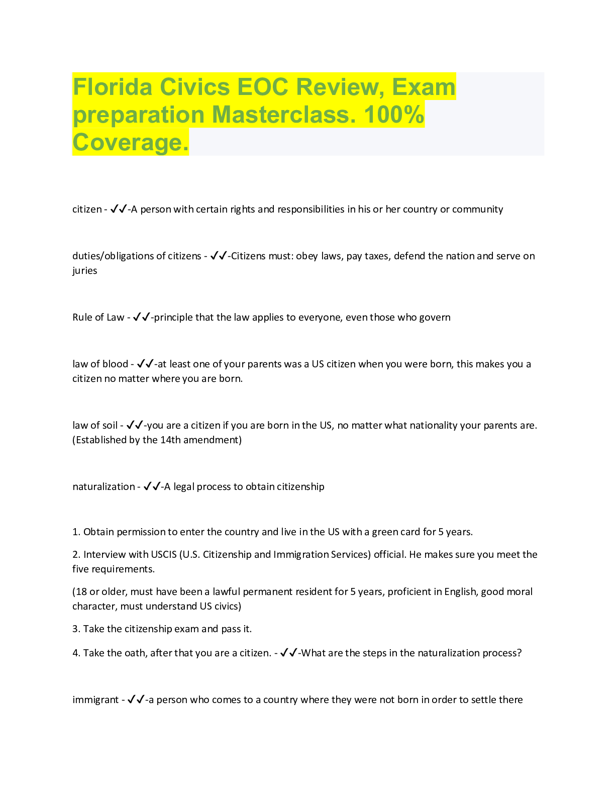 Florida Civics EOC Review, Exam preparation Masterclass. 100% Coverage. citizen - ✔✔-A person with certain rights and responsibilities in his or her country or community duties/obligations of ci...