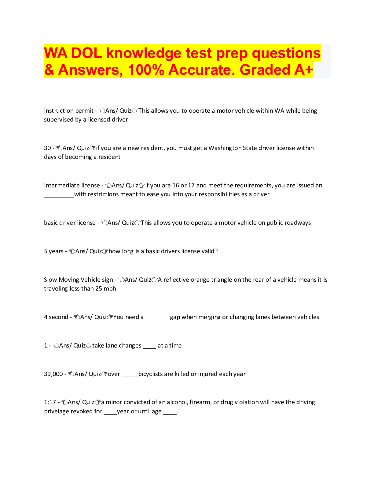 WA DOL knowledge test prep questions & Answers, 100% Accurate. Graded A+ instruction permit - ?Ans/ Quiz?This allows you to operate a motor vehicle within WA while being supervised by a licensed d...