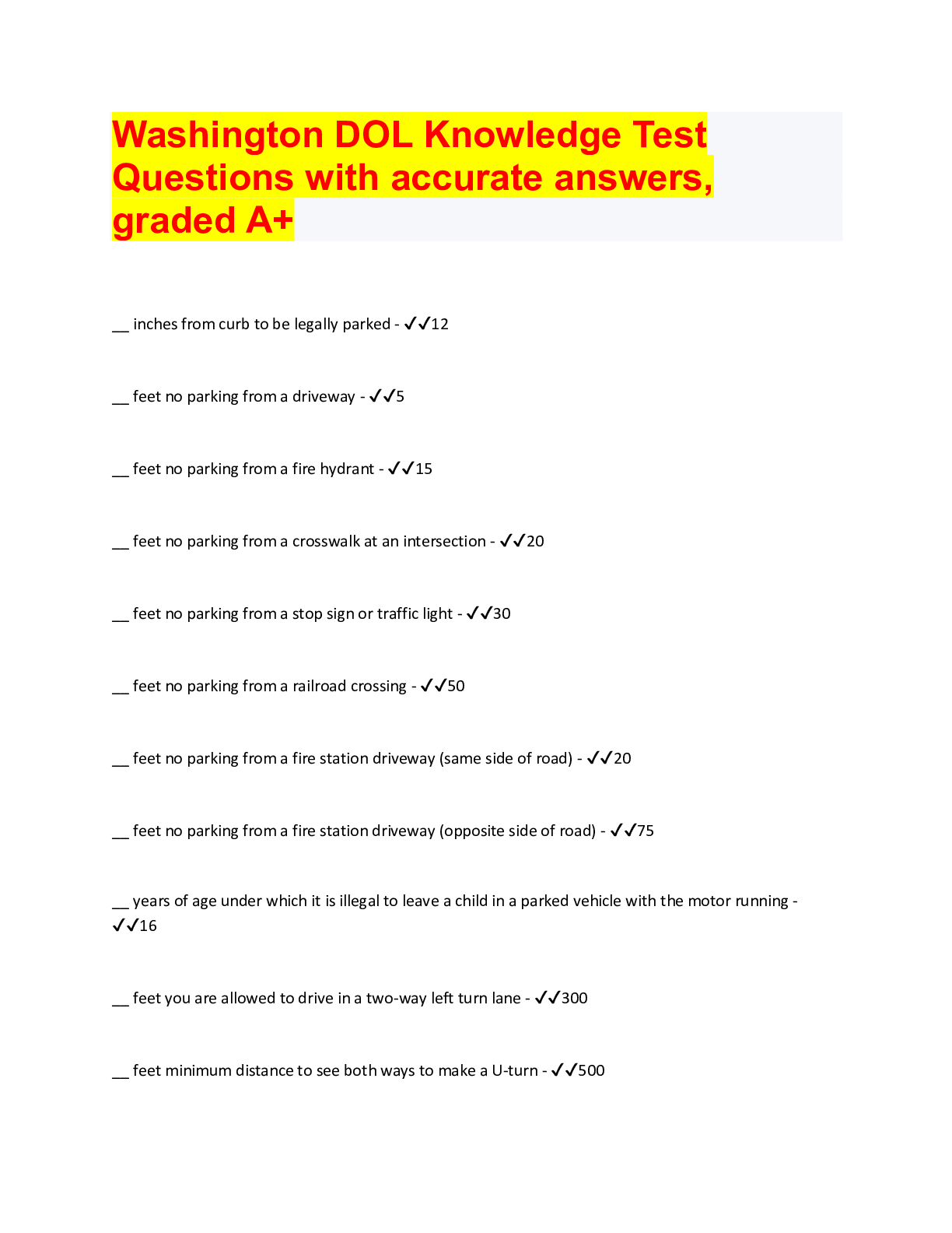 Driving Course> QUESTIONS & ANSWERS > Washington DOL Knowledge Test Questions with accurate answers, graded A+ (All)