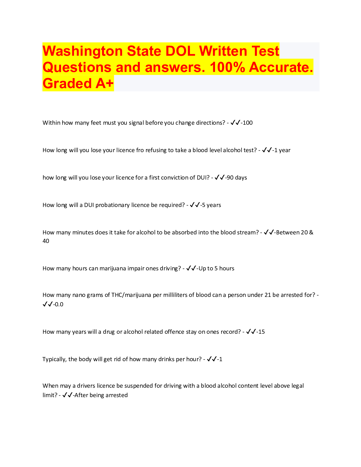 Washington State DOL Written Test Questions and answers. 100% Accurate. Graded A+ Within how many feet must you signal before you change directions? - ✔✔-100 How long will you lose your licence f...
