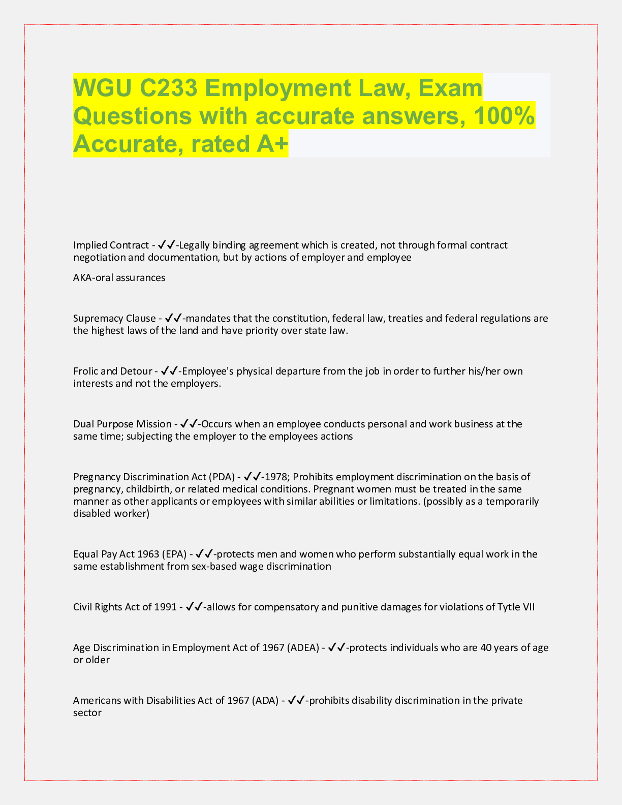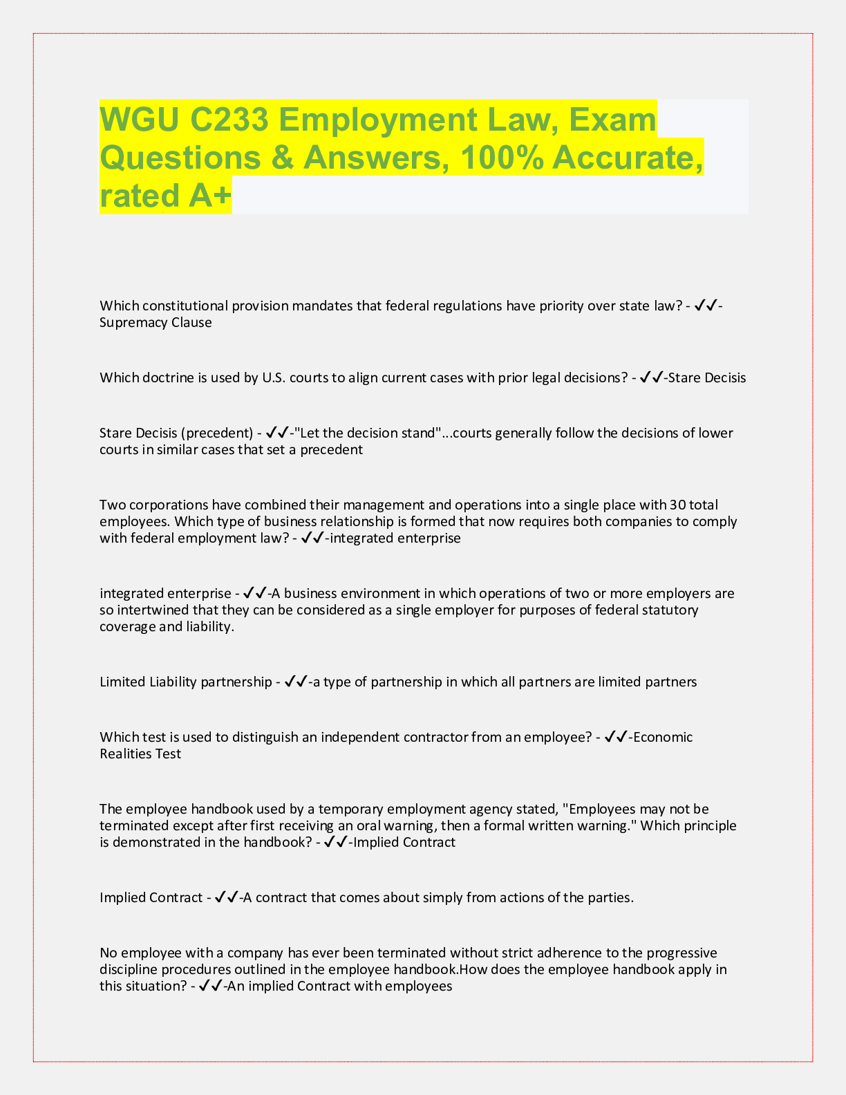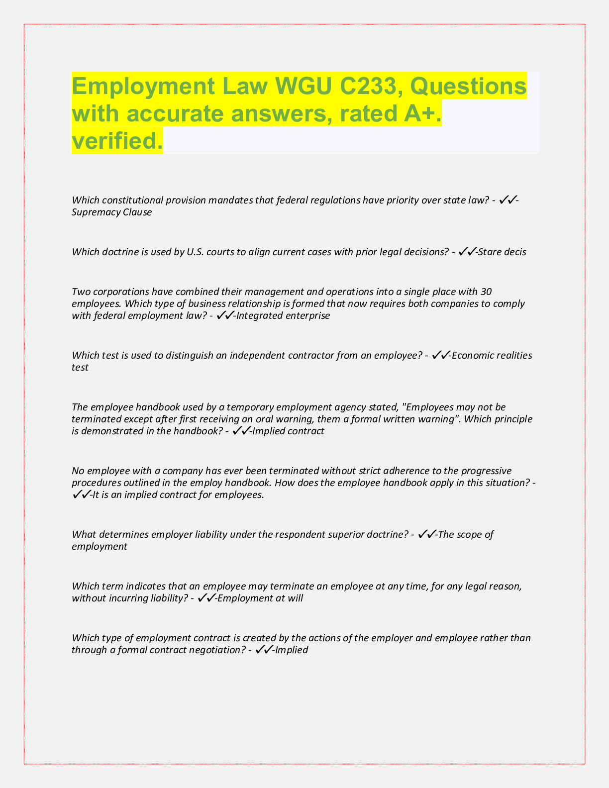 WGU C233 Employment Law, Exam Questions with accurate answers, rated A+. 39 VERSIONS, APPROVED PASS RATE... [Show More]