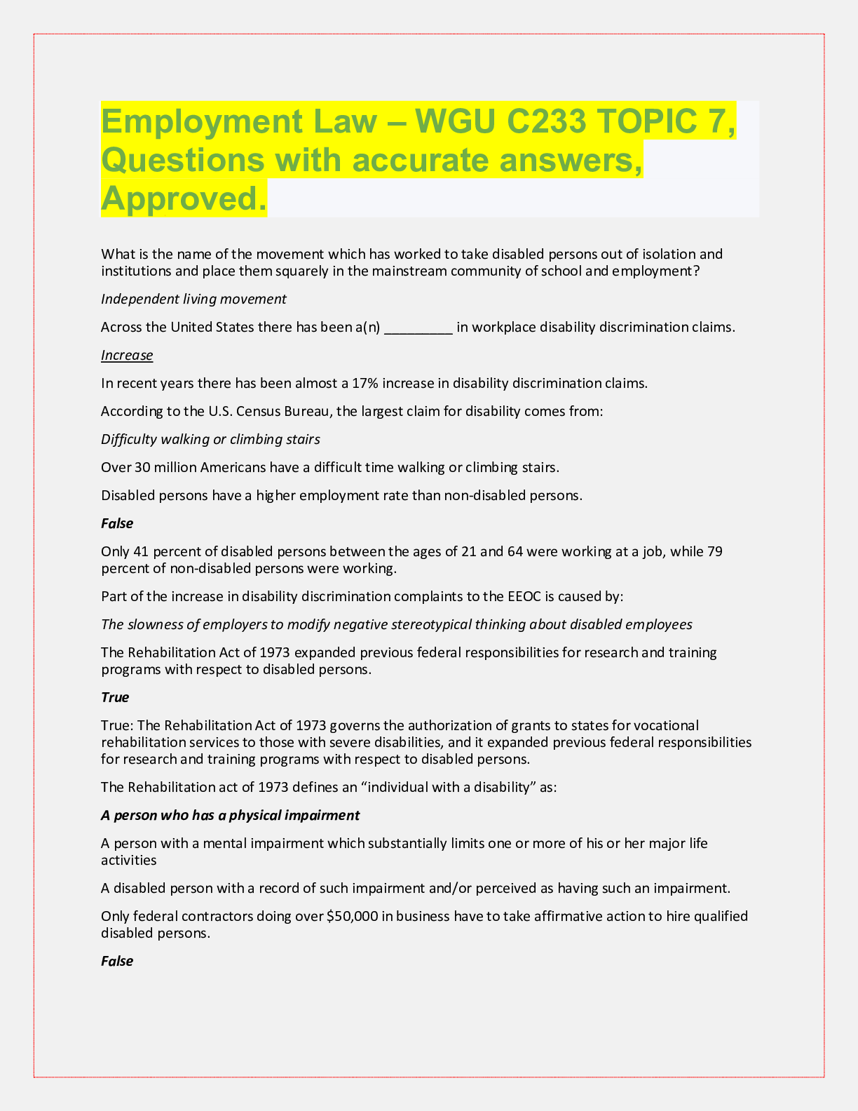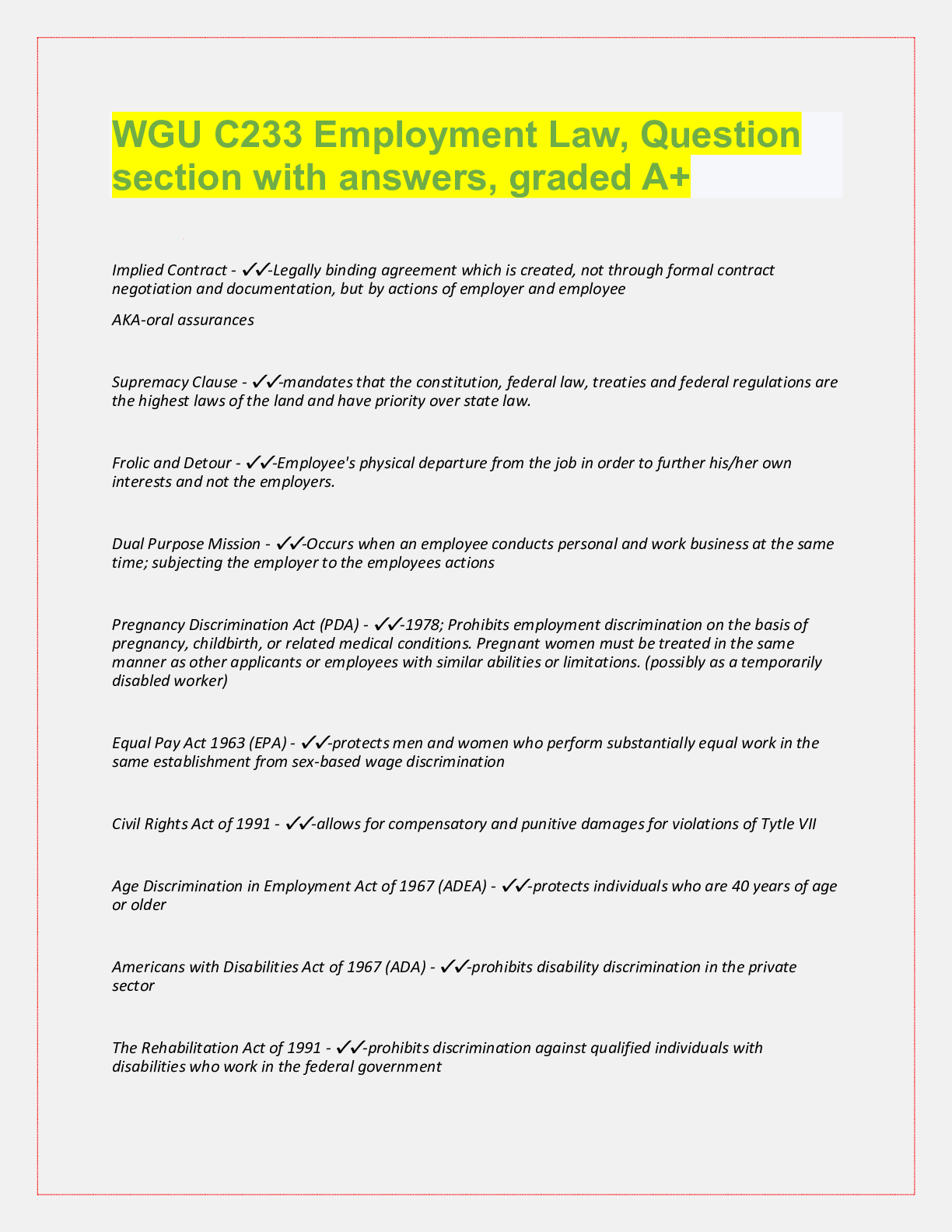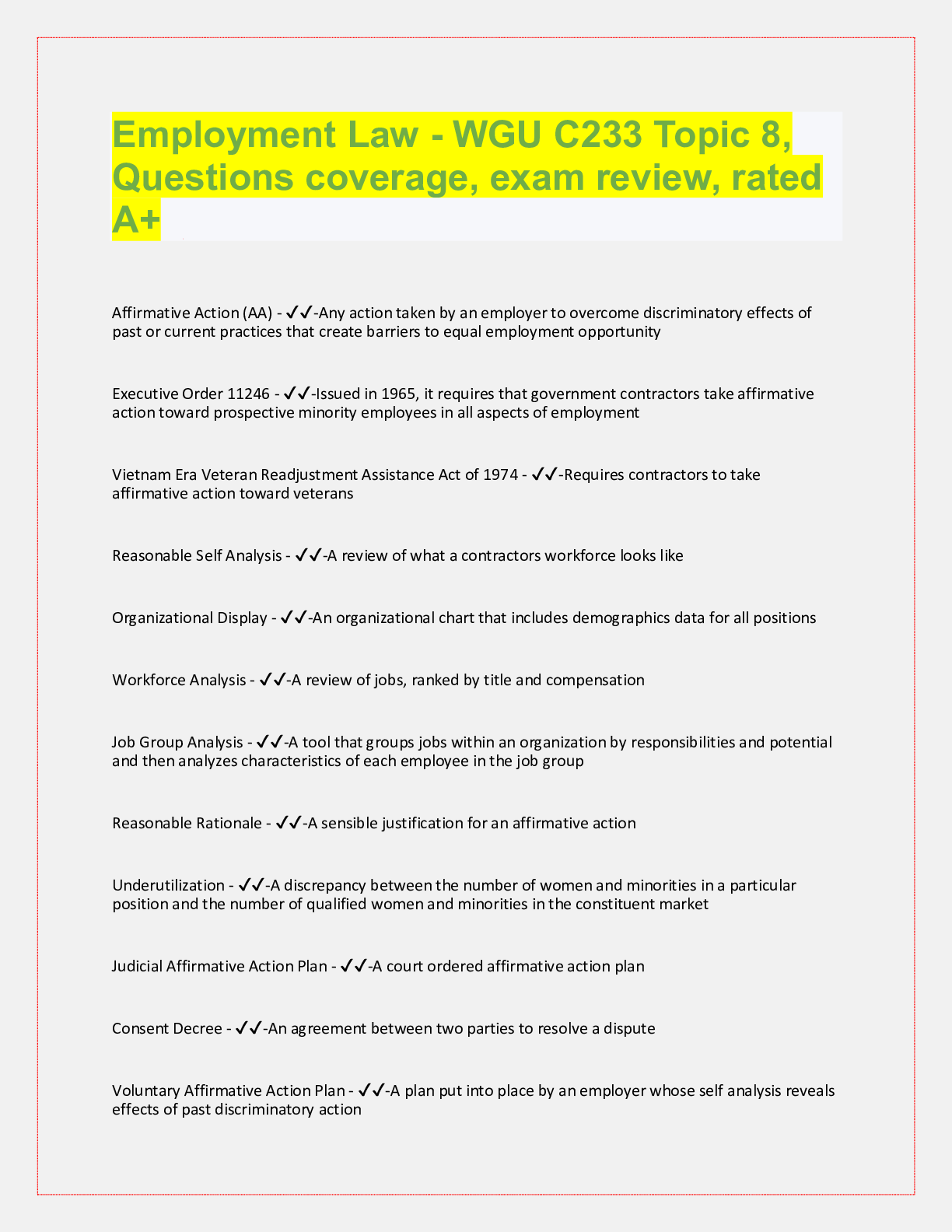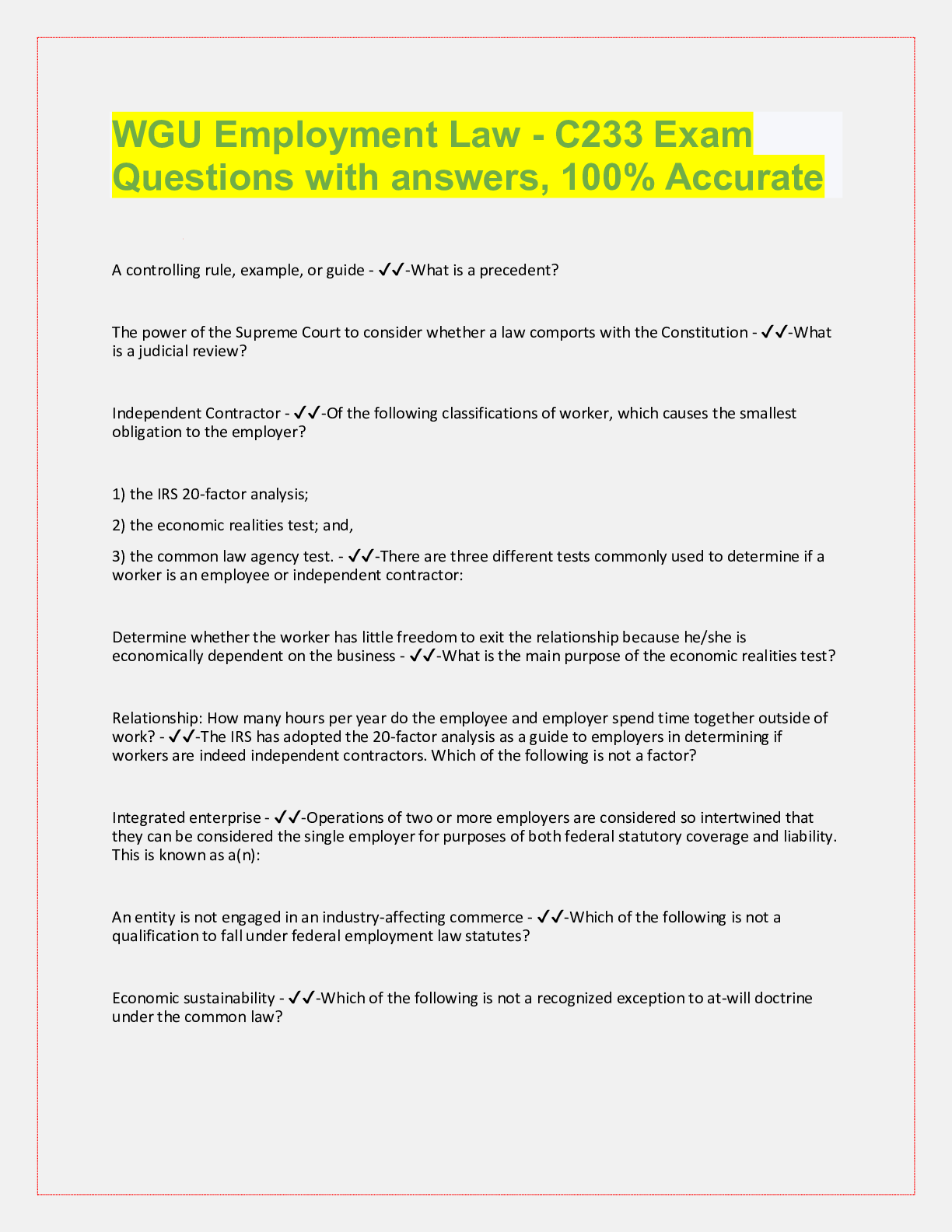 WGU C233 Employment Law, Exam Questions with accurate answers, rated A+. 39 VERSIONS, APPROVED PASS RATE... [Show More]