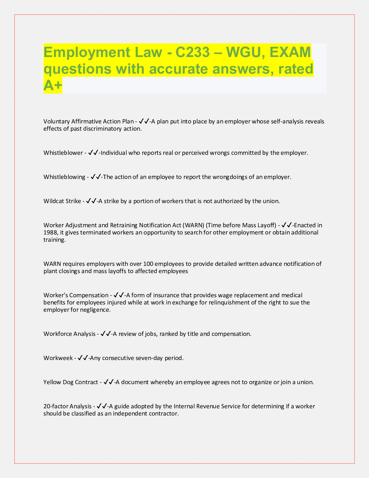 Law> QUESTIONS & ANSWERS > Employment Law: Vocabulary - C233 WGU, Full Coverage, Graded A+ (All)