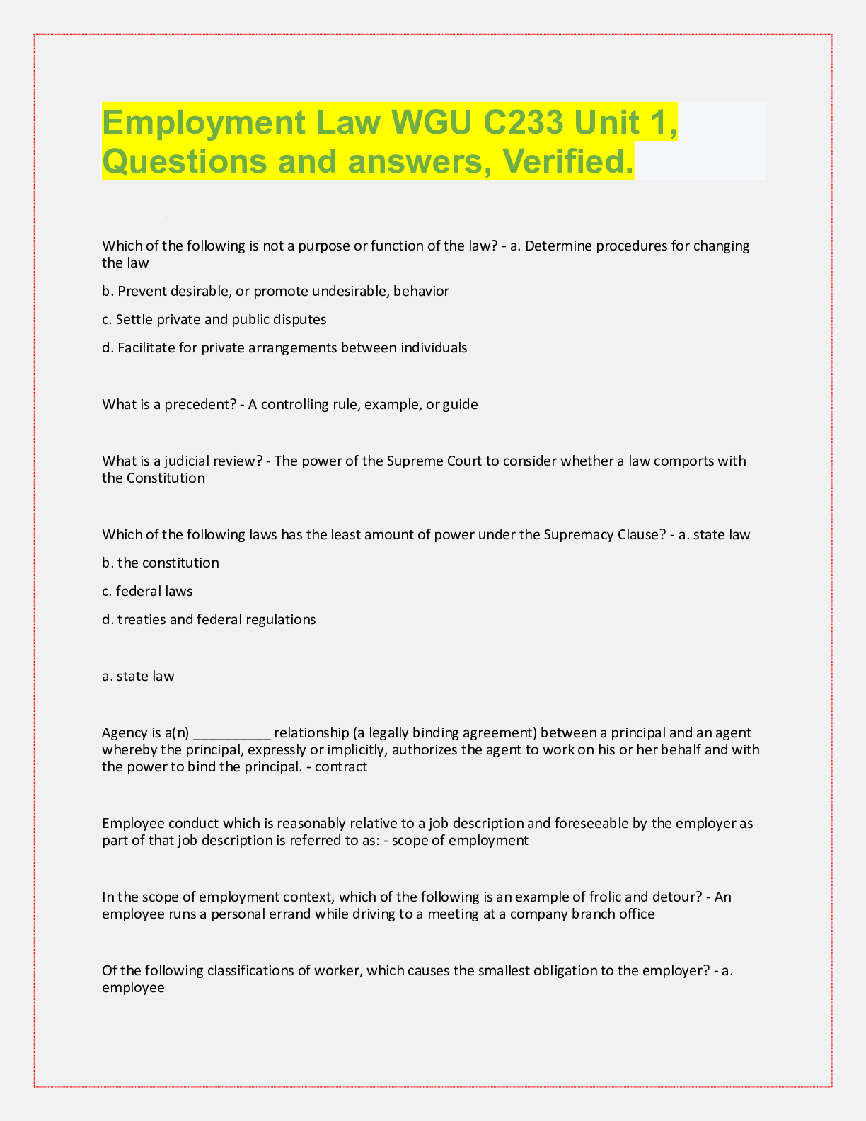 WGU C233-- Employment Law: Topics 1 & 2, questions and answers, verified. Supremacy Clause - ✔✔-Mandates that the constitution, federal laws, treaties and federal regulations are the highest laws...