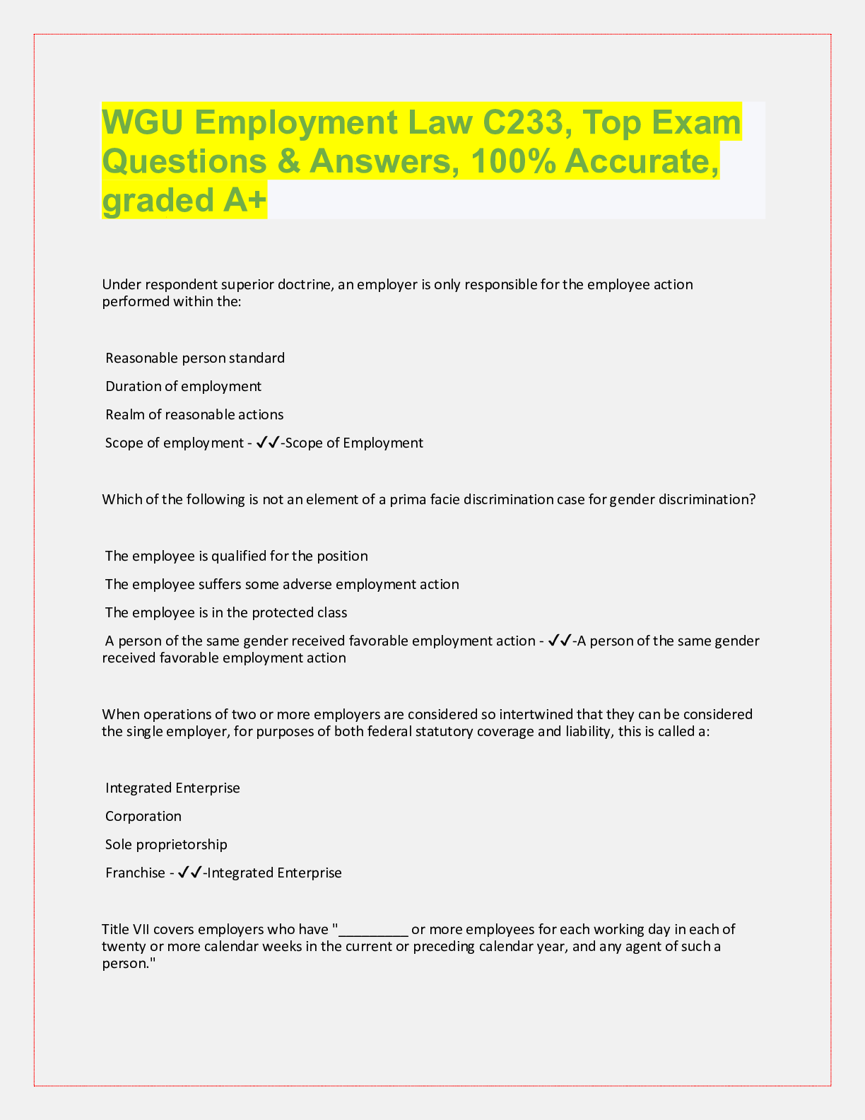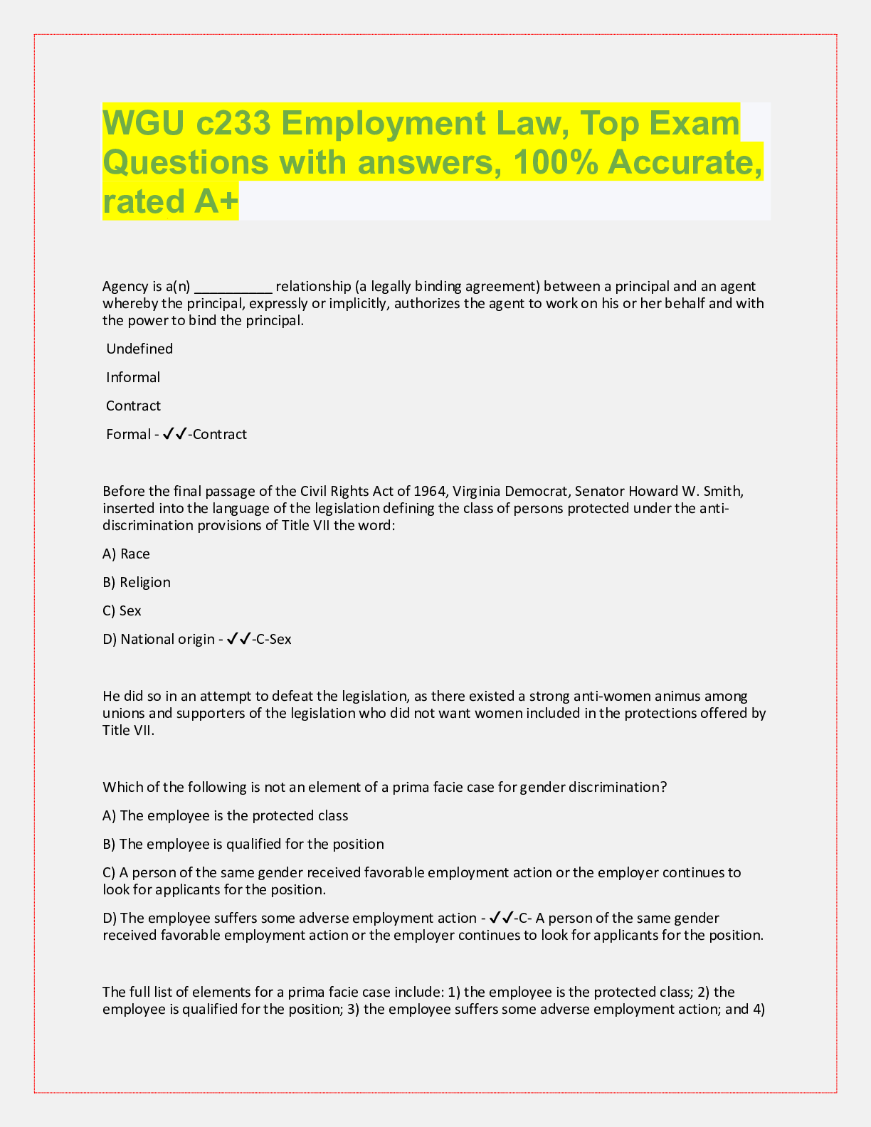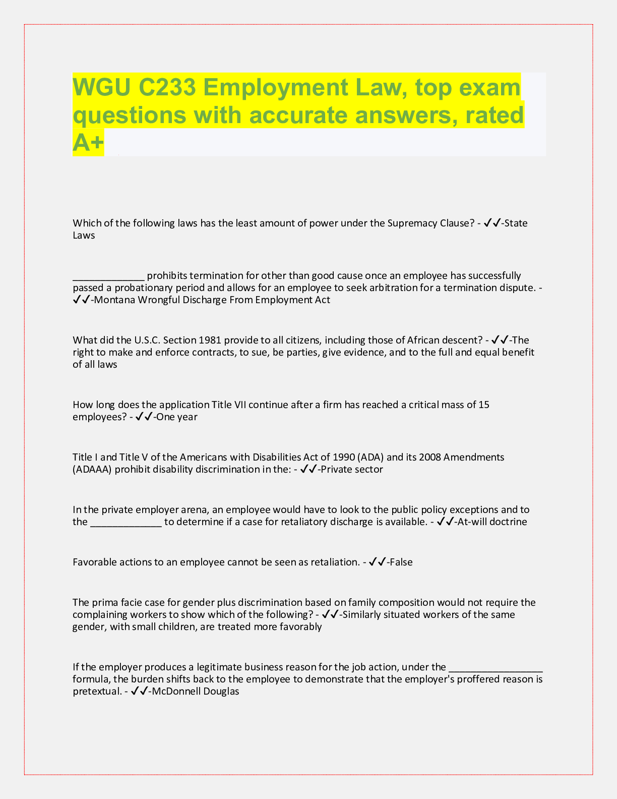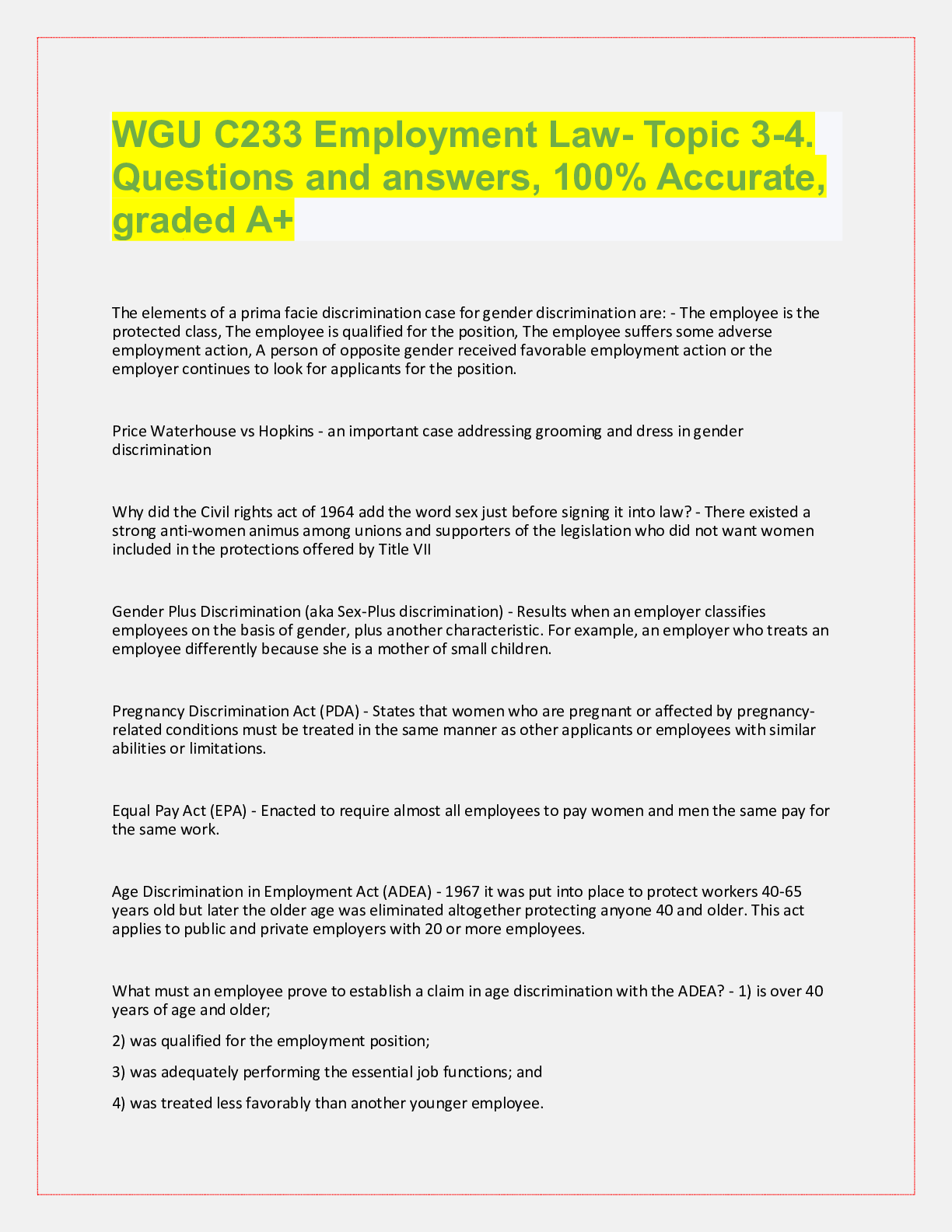 Law> QUESTIONS & ANSWERS > WGU C233 Employment Law, top exam questions with accurate answers, rated A+ (All)