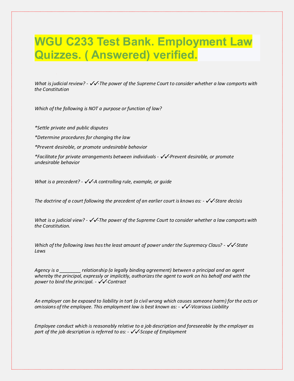 WGU C233 Test Bank. Employment Law Quizzes. ( Answered) verified. What is judicial review? - ✔✔-The power of the Supreme Court to consider whether a law comports with the Constitution Which of t...