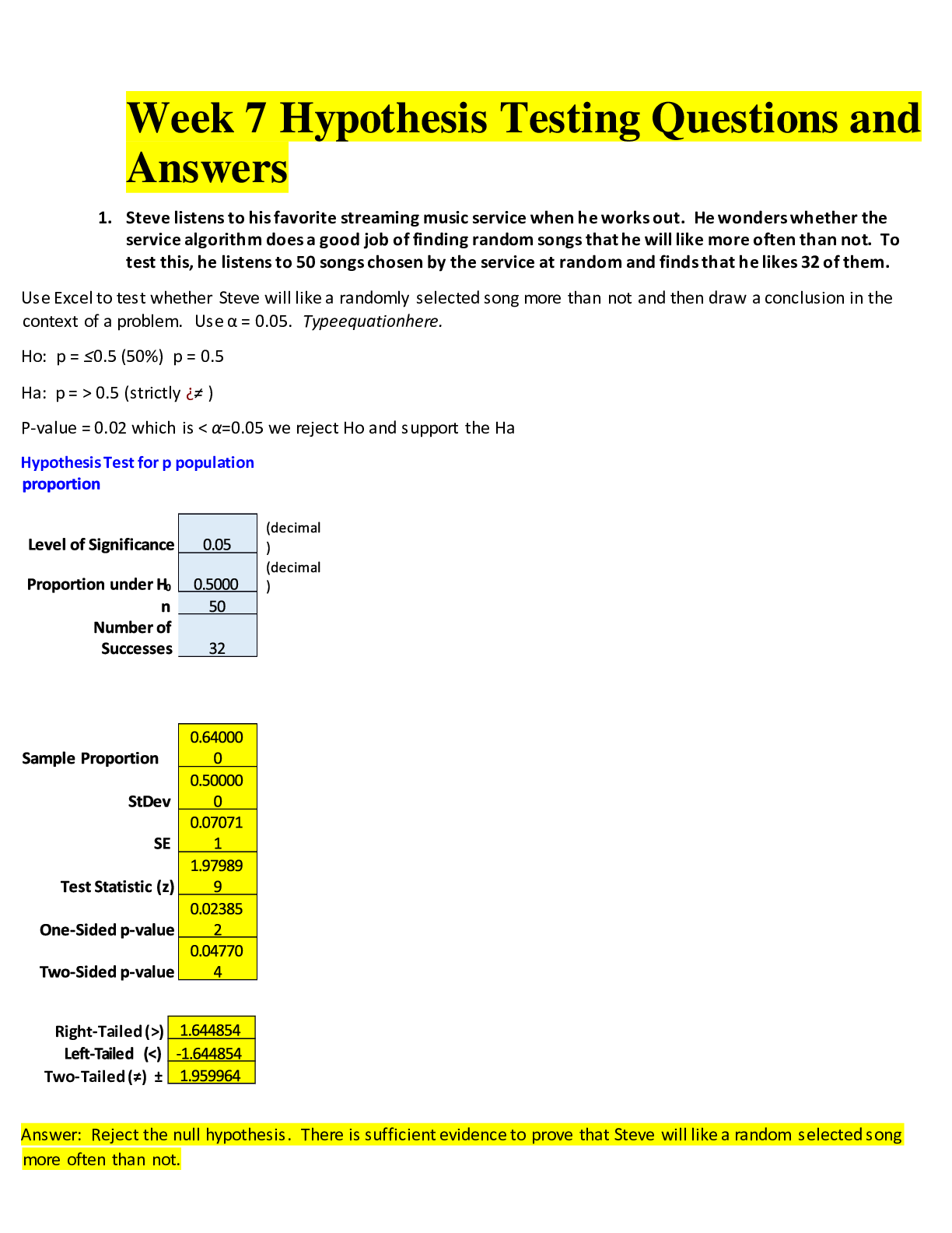 MATH 225N Week 7 Hypothesis Testing Questions and Answers (A+ Solutions) - 1. Steve listens to his favorite streaming music service when he works out. He wonders whether the service algorithm does a...