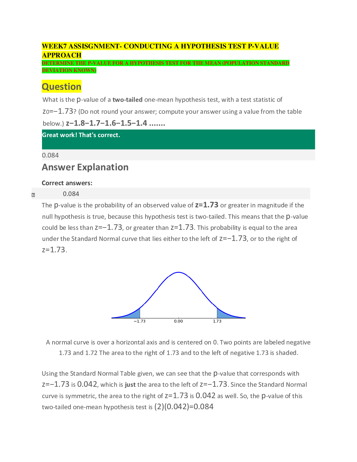 WEEK7 ASSISGNMENT- CONDUCTING A HYPOTHESIS TEST P-VALUE APPROACH DETERMINE THE P-VALUE FOR A HYPOTHESIS TEST FOR THE MEAN (POPULATION STANDARD DEVIATION KNOWN) - What is the p-value of a two-tailed on...