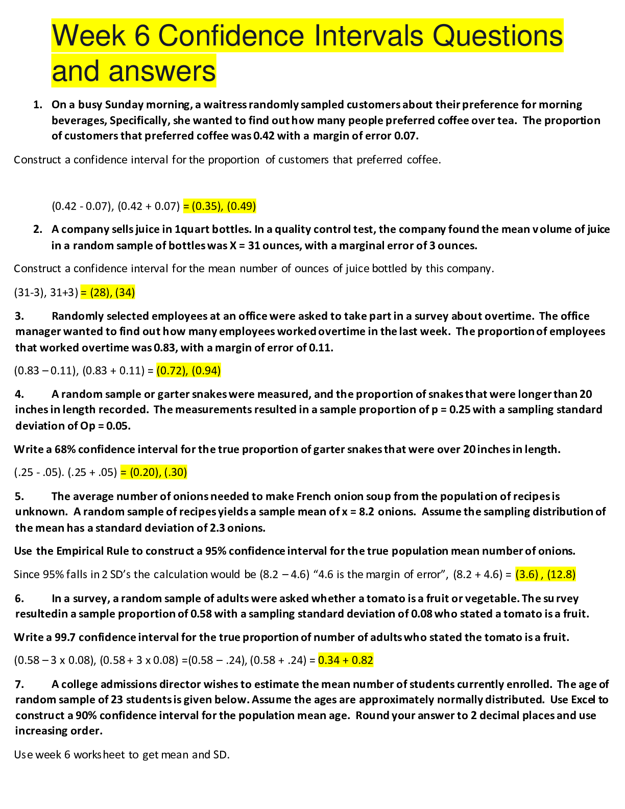 MATH 225N Week 7 Lab Assignment Complete solution guide) - Confidence Intervals CI) are basically the range of values we are fairly sure that our true values falls within. According to El-Masri, M. (2...