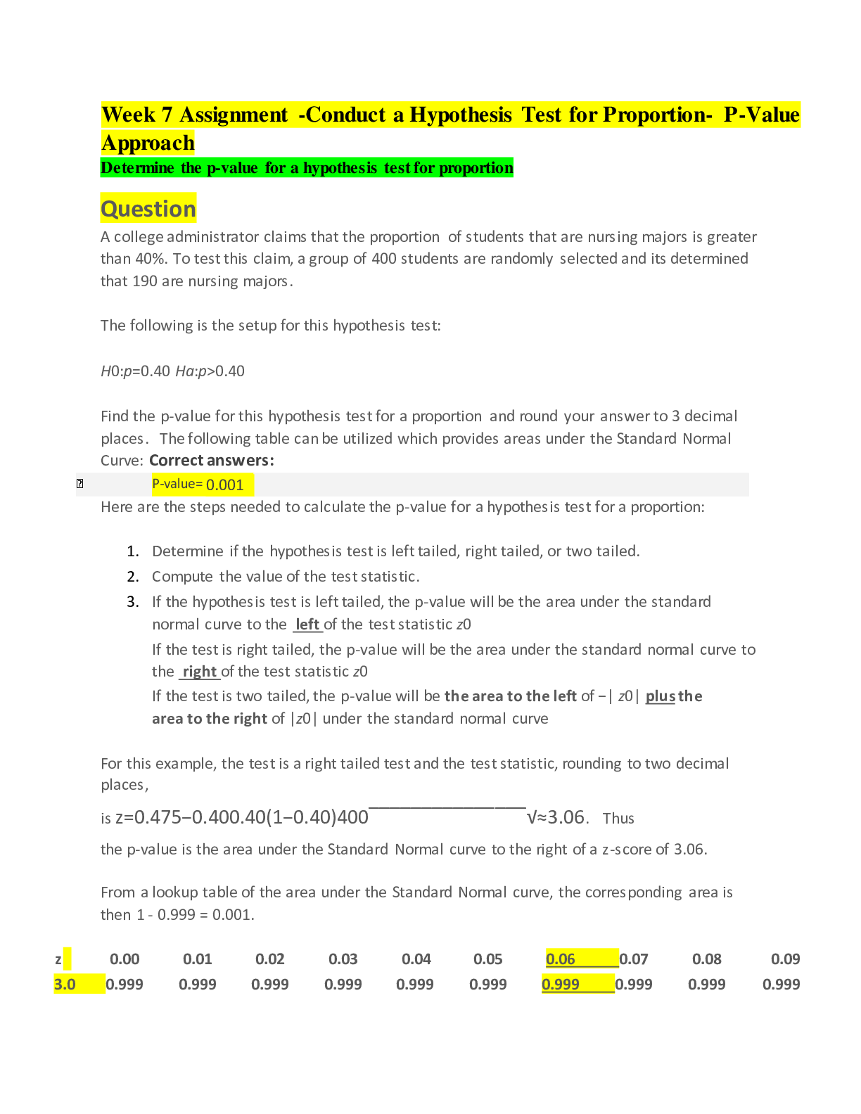 Mathematics> QUESTIONS & ANSWERS > MATH 225N Week 7 Assignment- Developing Hypothesis and understanding Possible Conclusion for Proportions (2020 complete A solutions) - Chamberlain (All)