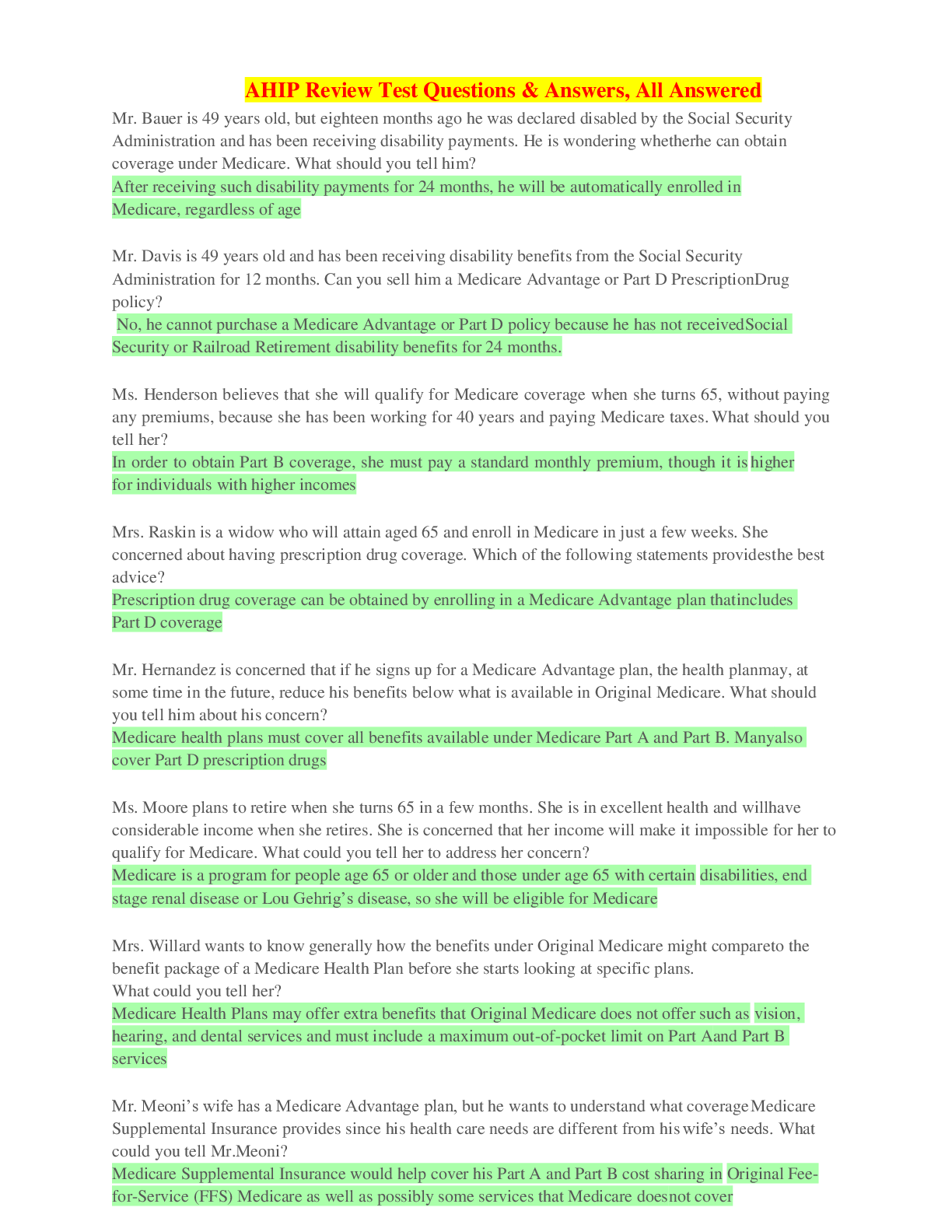 AHIP Review Test Questions & Answers, All Answered-Mr. Bauer is 49 years old, but eighteen months ago he was declared disabled by the Social Security Administration and has been receiving disability p...