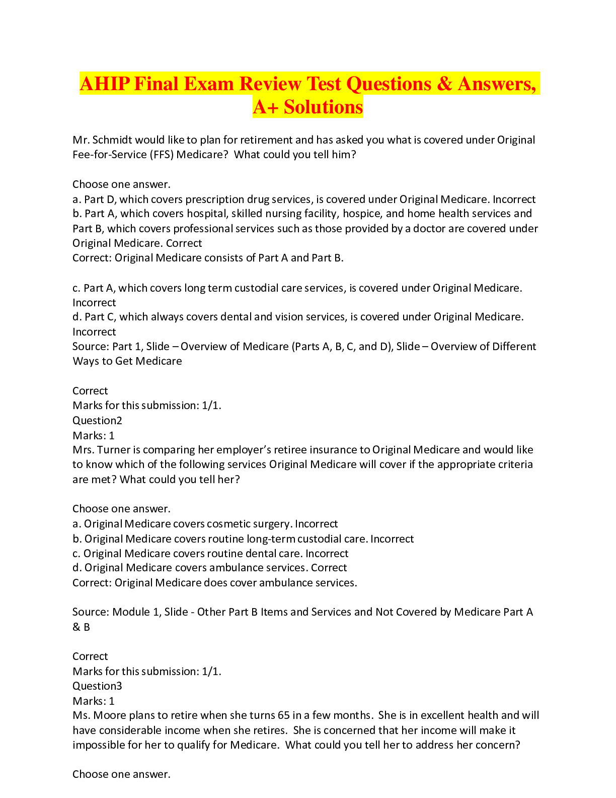 AHIP Final Exam Review Test Questions & Answers, A+ Solutions-Mr. Schmidt would like to plan for retirement and has asked you what is covered under Original Fee-for-Service (FFS) Medicare? What could...