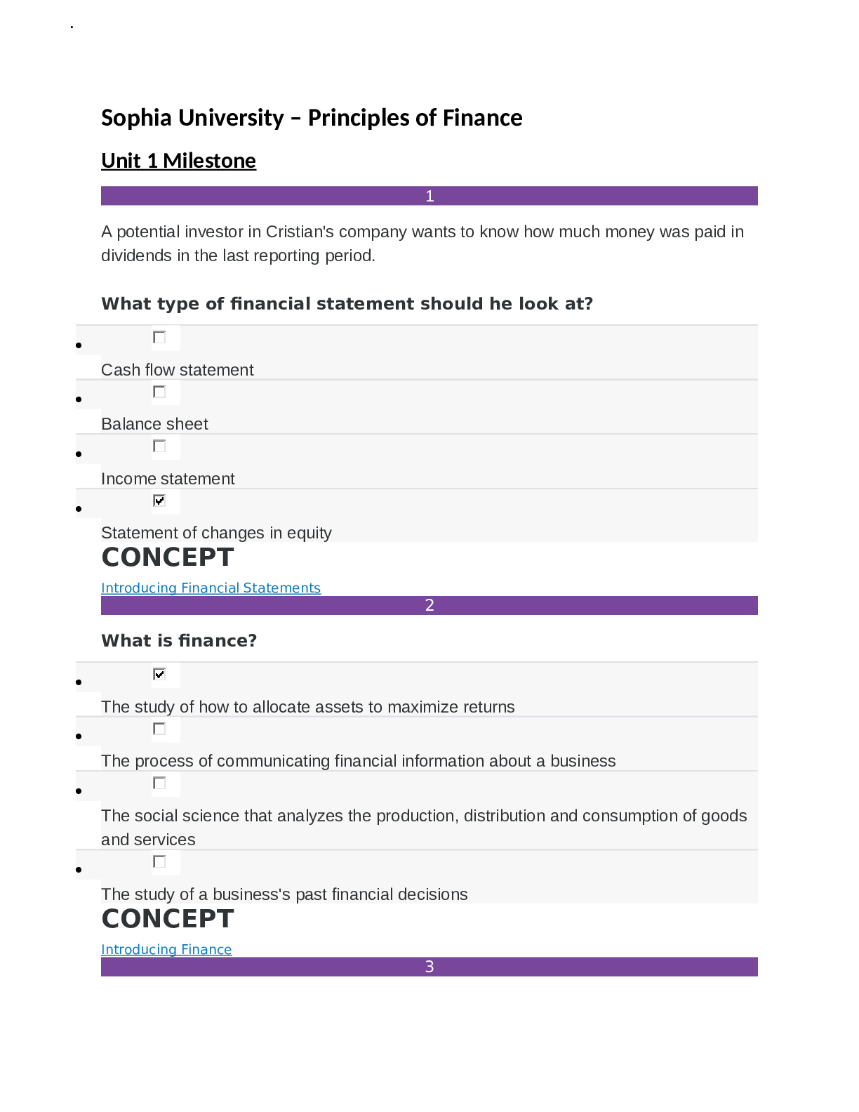 Finance > EXAM > Sophia University – Principles of Finance Unit 1 Milestone (All)