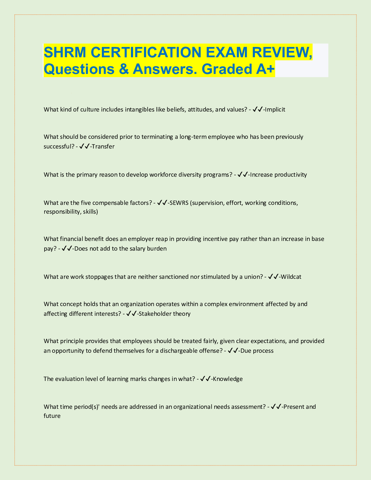 Human Resource Management > EXAM > SHRM CERTIFICATION EXAM REVIEW | 130 Questions with 100% Correct Answers (All)