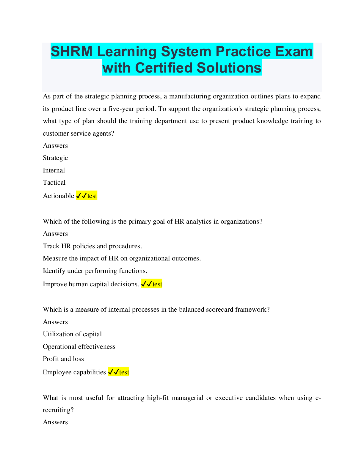 Human Resource Management > EXAM > SHRM Learning System Practice Exam with Certified Solutions (All)