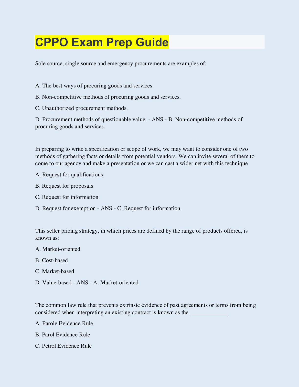 Procurement > EXAM > CPPO Exam Prep Guide | 90 Questions with 100% Correct Answers | Updated & Verified (All)