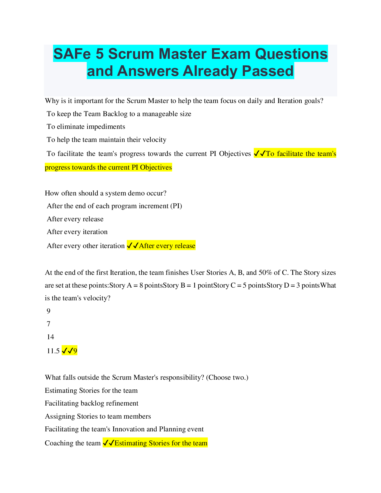Procurement > EXAM > SAFe 5 Scrum Master Exam Questions and Answers Already Passed (All)