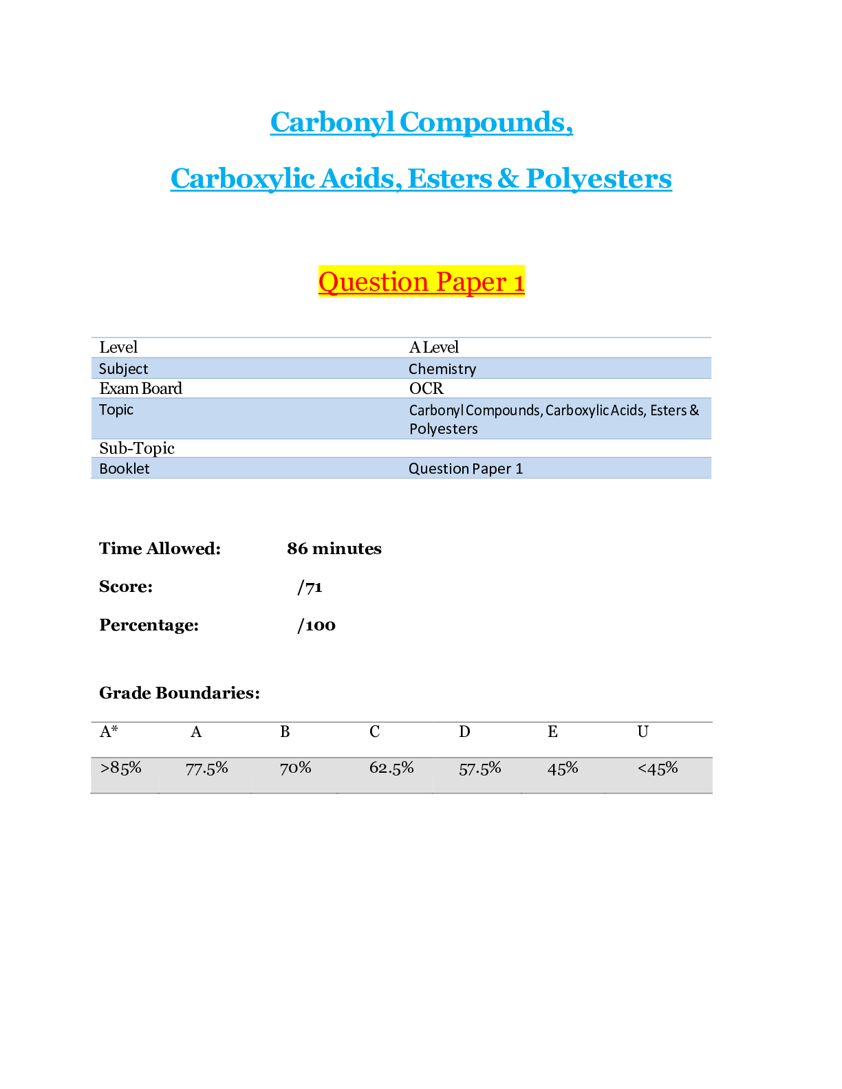 Chemistry > EXAM > A level_OCR_Chemistry_Paper 1_2020 | SPS F108 12.1_Carbonyl Compounds, Carboxylic Acids, Esters & Polyesters | QUESTIONS ONLY (All)