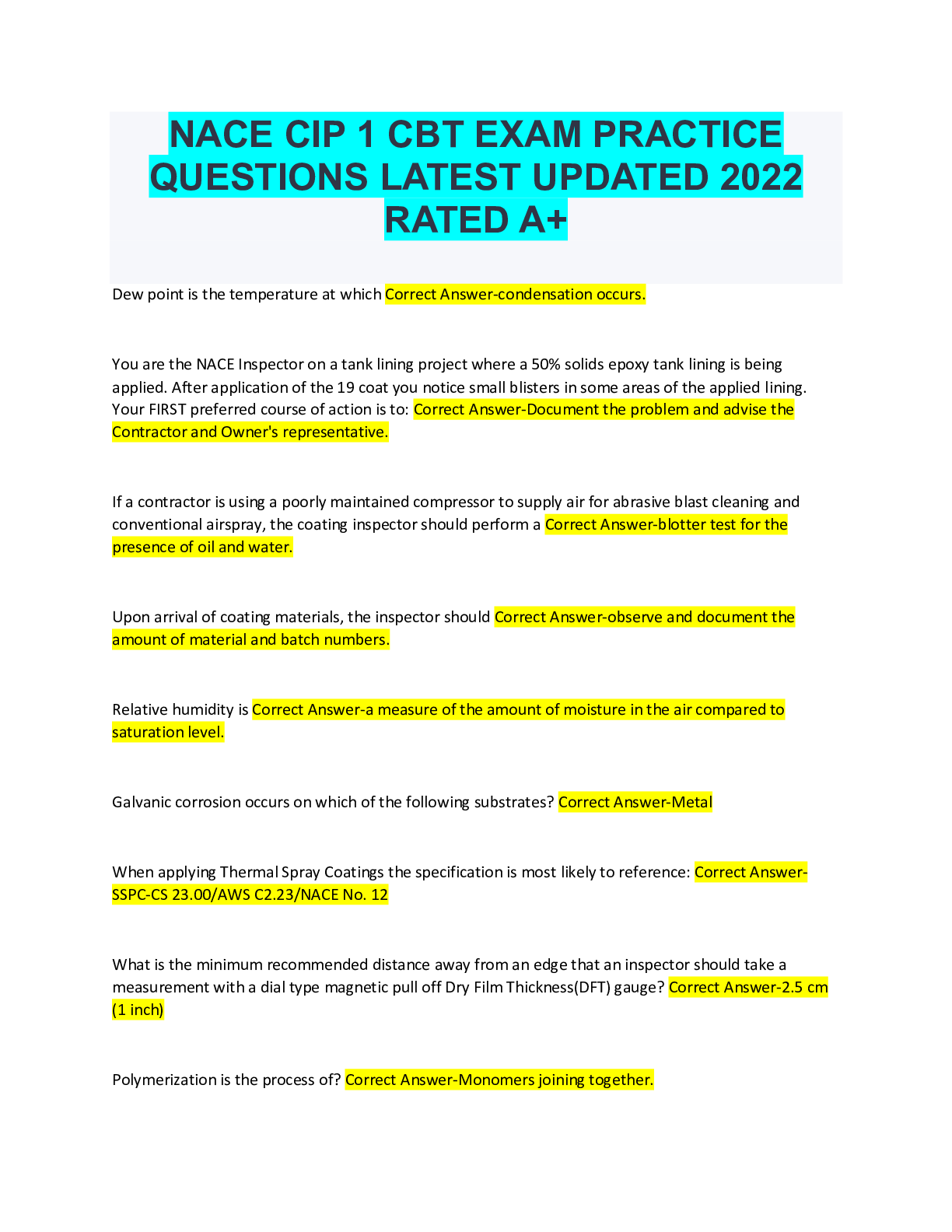 Environmental Science > EXAM > NACE CIP 1 CBT EXAM PRACTICE QUESTIONS LATEST UPDATED 2022 RATED A+ (All)