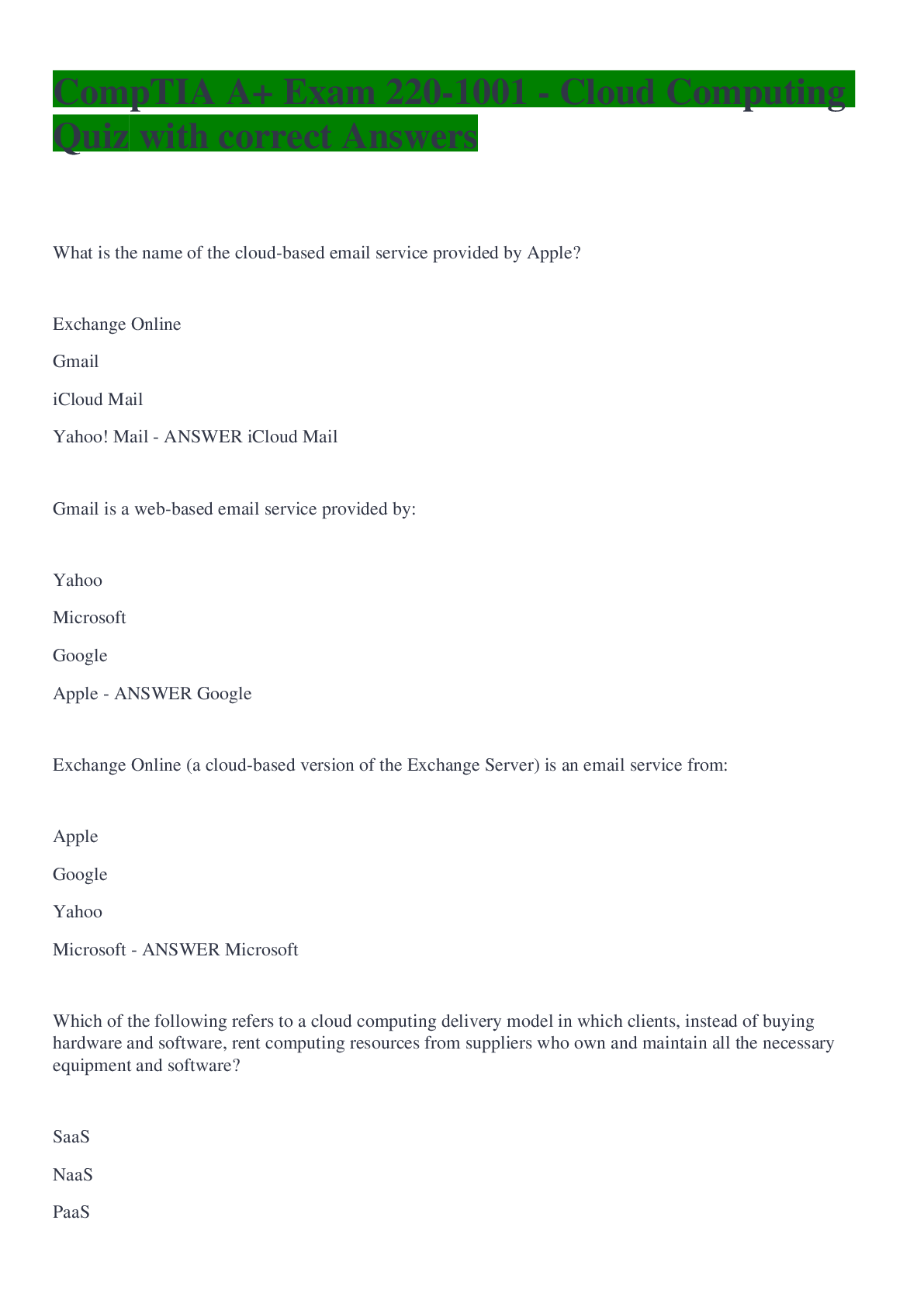 Computer Science > EXAM > CompTIA A+ Exam 220-1001 - Cloud Computing Quiz with correct Answers (All)