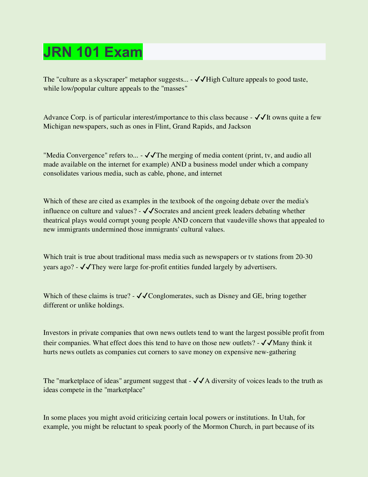 Media Studies > EXAM > JRN 101 Exam | 100 Questions with 100% Correct Answers | Updated & Verified (All)