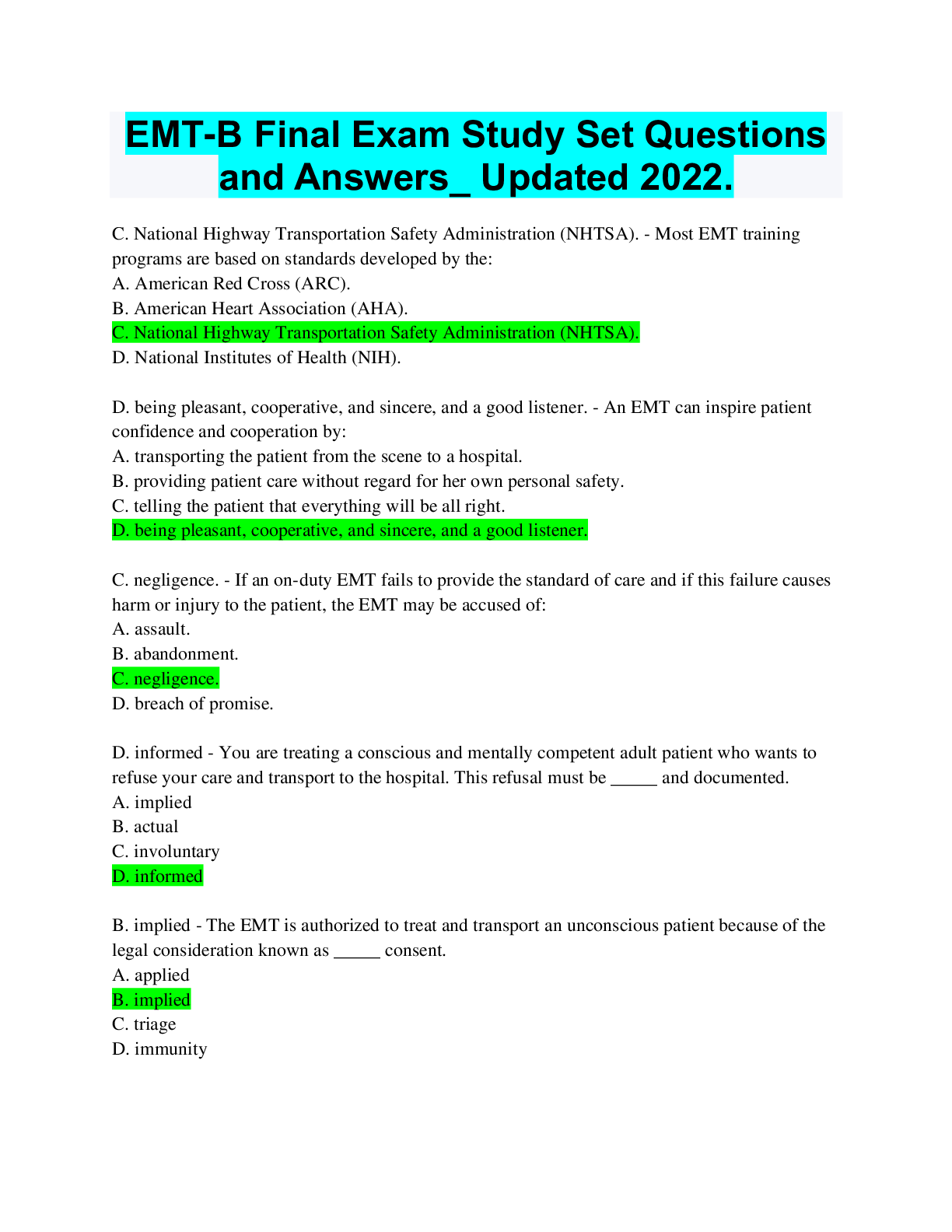 Emergency Medicine > EXAM > Emergency Medical Technician; EMT-B Final Exam Test Bank Study Set Questions and Answers_ 2022. (All)