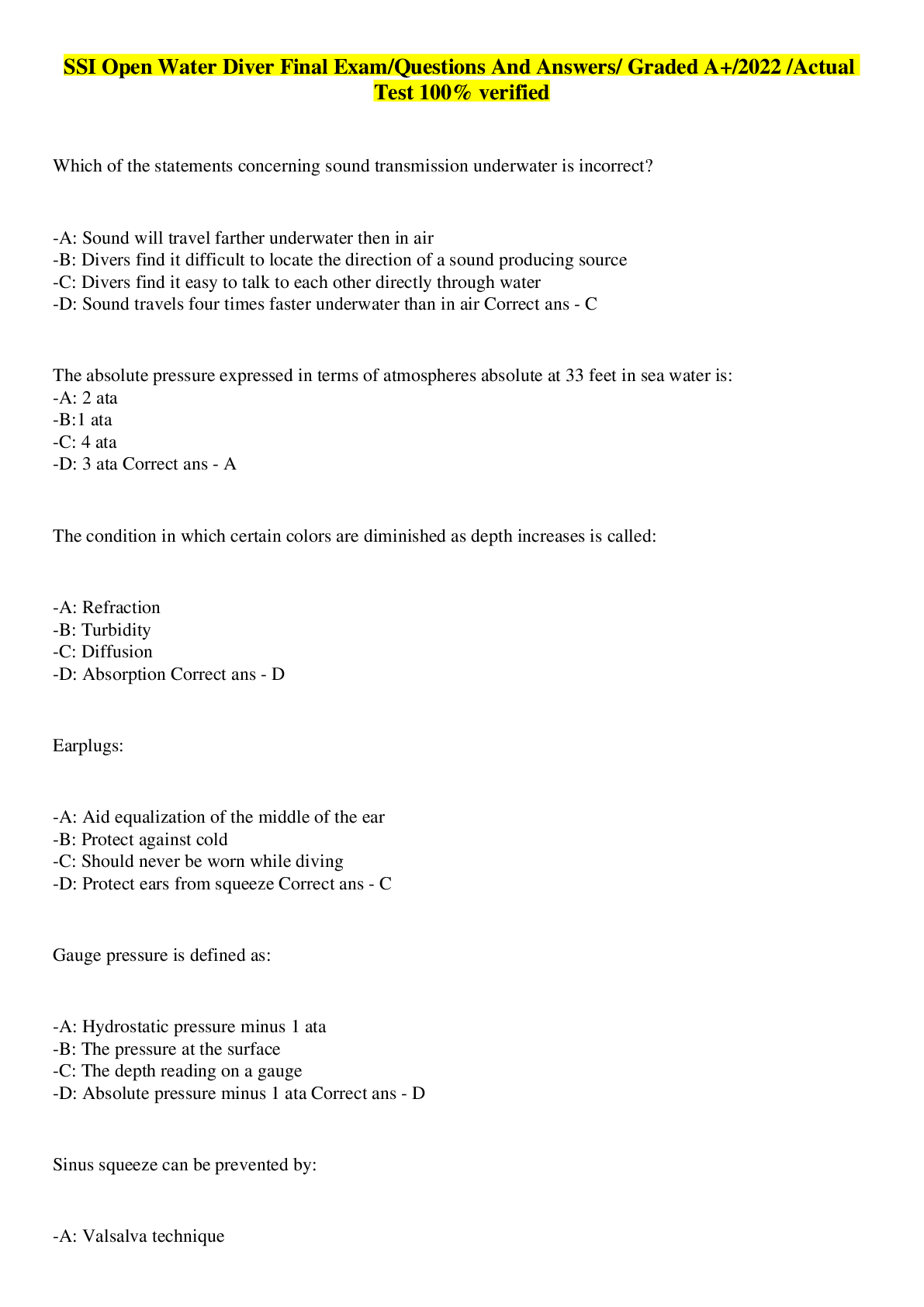Emergency Medicine > EXAM > SSI Open Water Diver Final Exam - Questions and Correct Answers (All)