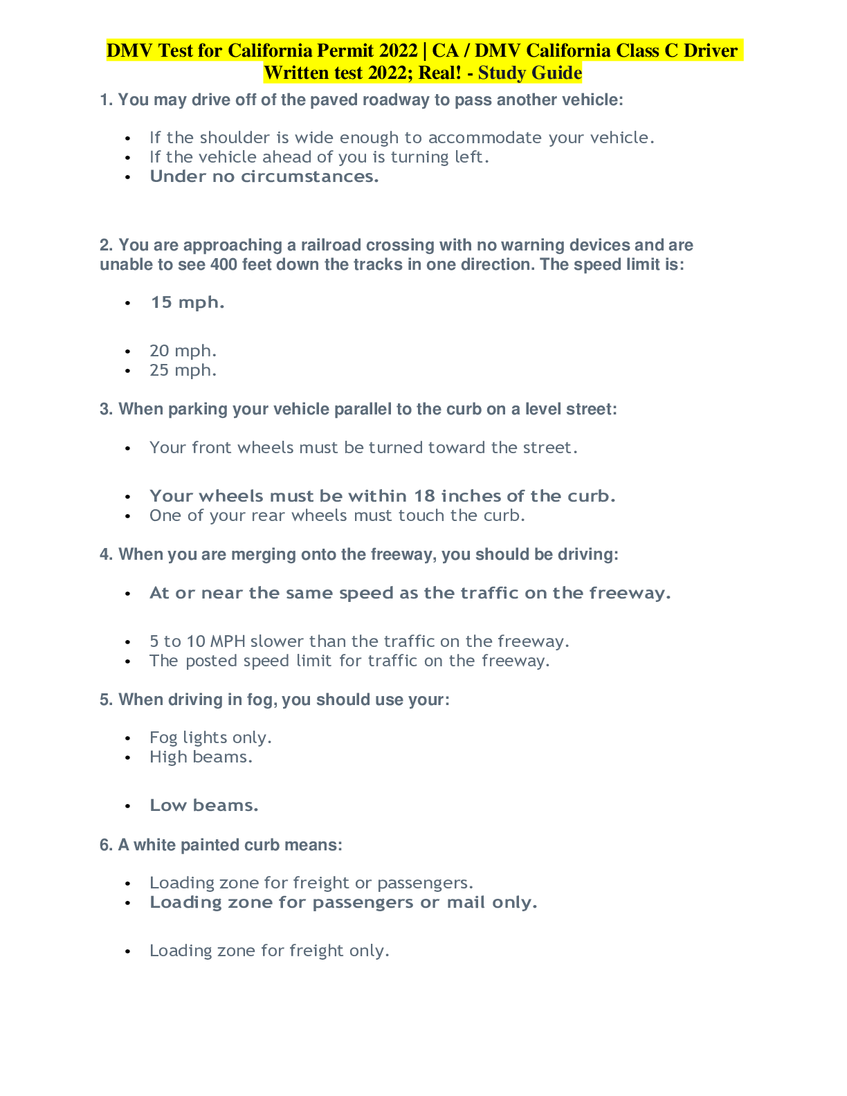 Global Citizenship > EXAM > DMV Test for California Permit 2022 | CA / DMV California Class C Driver Written test 2022; Real! (All)