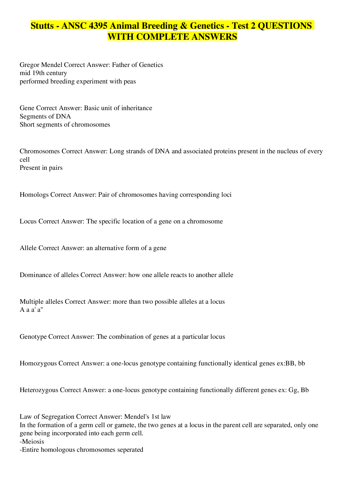 Animal Management > EXAM > Stutts - ANSC 4395 Animal Breeding & Genetics - Test 2 QUESTIONS WITH COMPLETE ANSWERS (All)