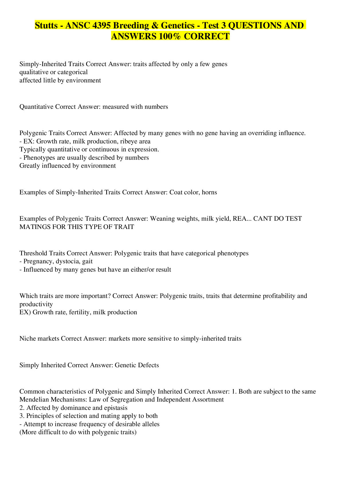 Animal Management > EXAM > Stutts - ANSC 4395 Breeding & Genetics - Test 3 QUESTIONS AND ANSWERS 100% CORRECT (All)
