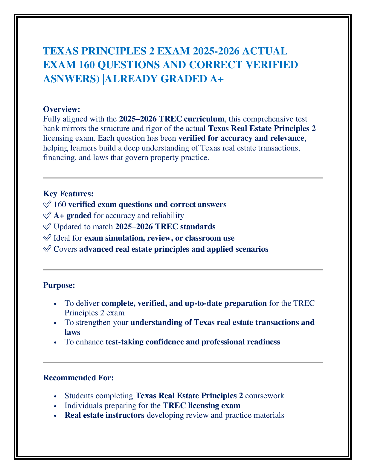 Law > EXAM > TEXAS PRINCIPLES 2 EXAM 2025-2026 ACTUAL EXAM 160 QUESTIONS AND CORRECT VERIFIED ASNWERS) |ALREADY GRADED A+ (All)