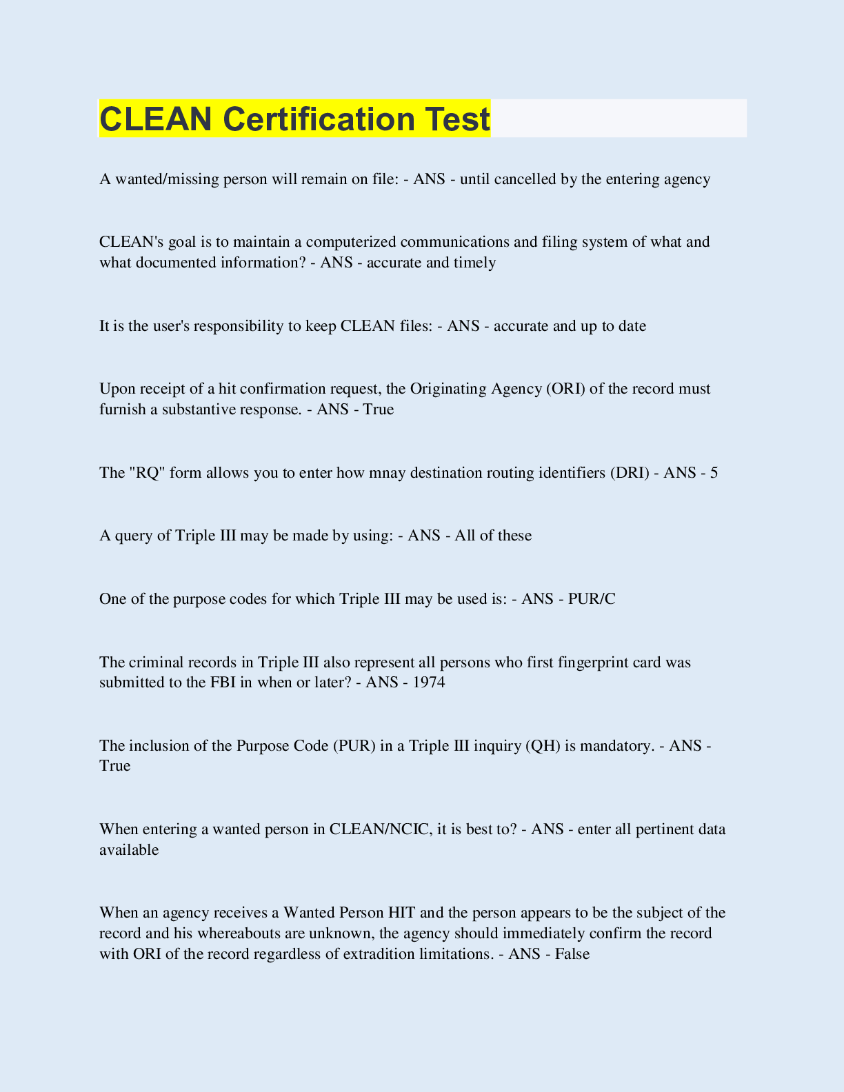 Law > EXAM > CLEAN Certification Test | 40 Questions with 100% Correct Answers | Updated & Verified (All)