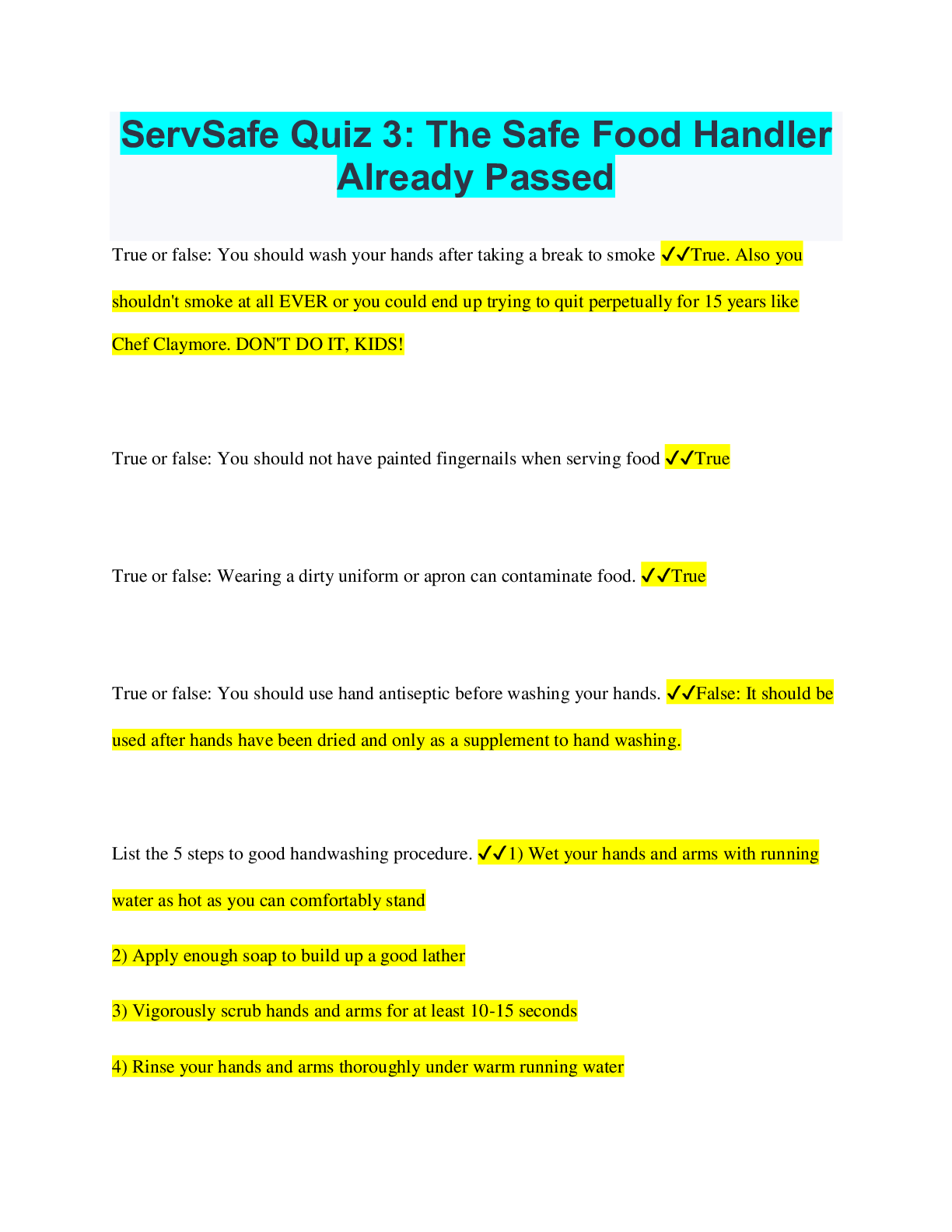 Safety Management > EXAM > ServSafe Quiz 3: The Safe Food Handler Already Passed (All)