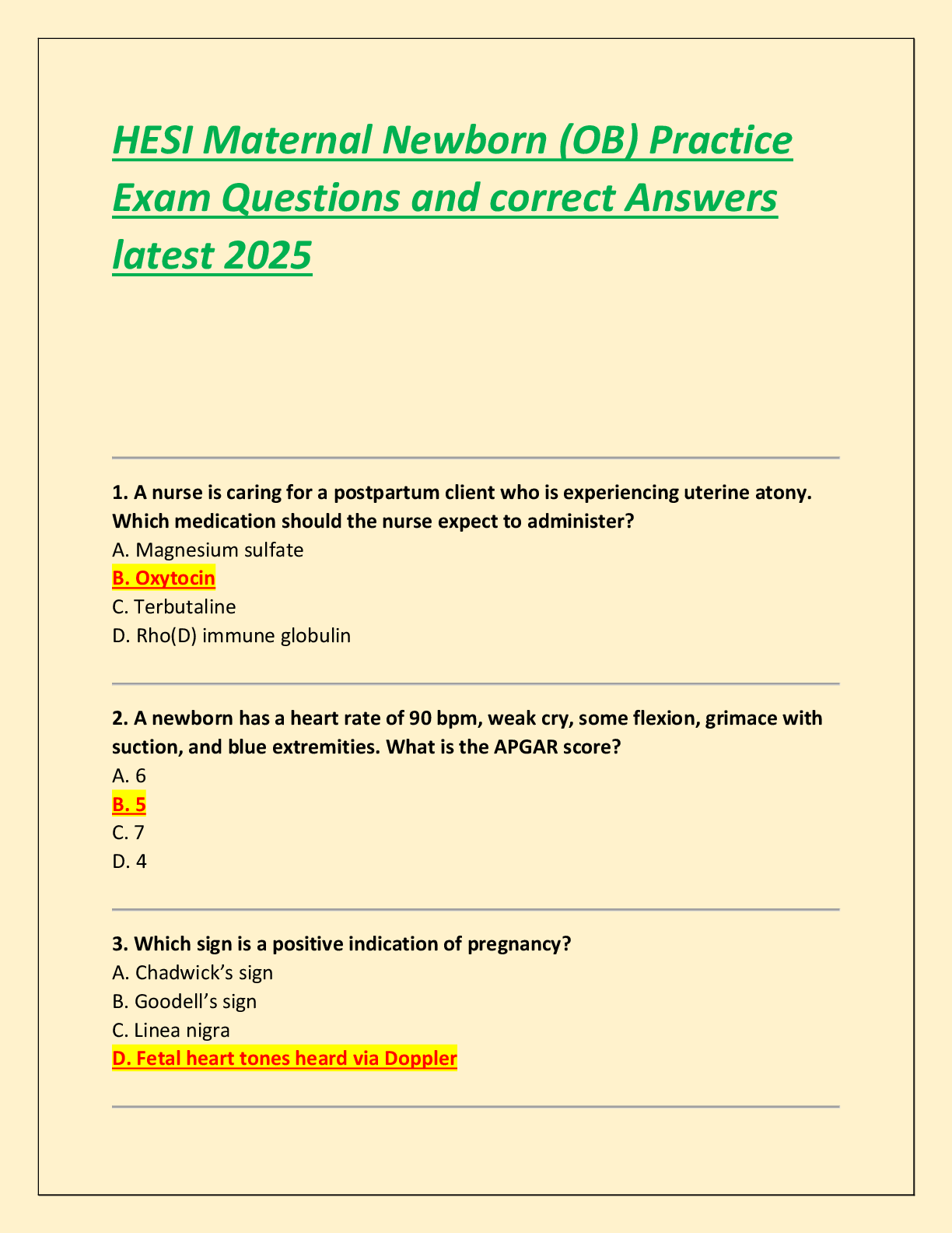 HESI OB Maternity > EXAM > HESI Maternal Newborn (OB) Practice Exam Questions and correct Answers latest 2025 (All)