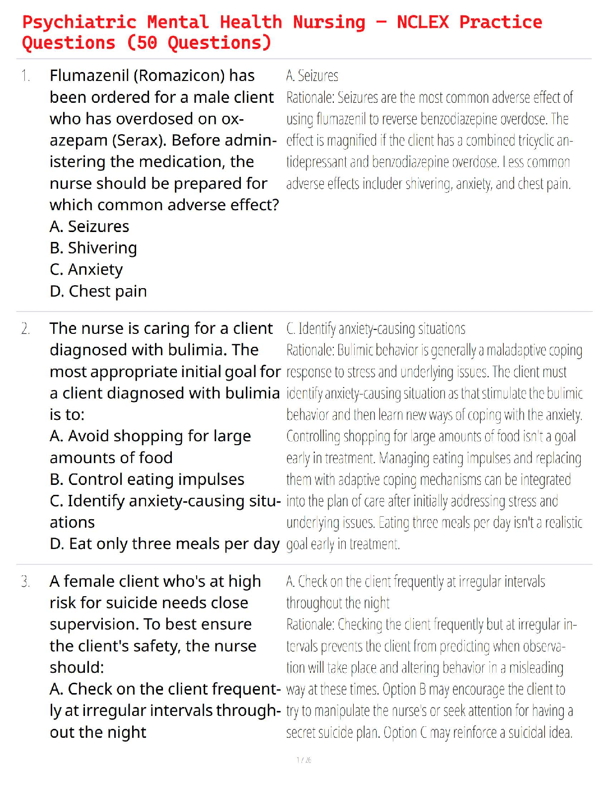 PSYCHIATRIC/MENTAL HEALTH NURSING > EXAM > Psychiatric Mental Health Nursing – NCLEX Practice Questions (50 Questions) | Verified & Updated (All)